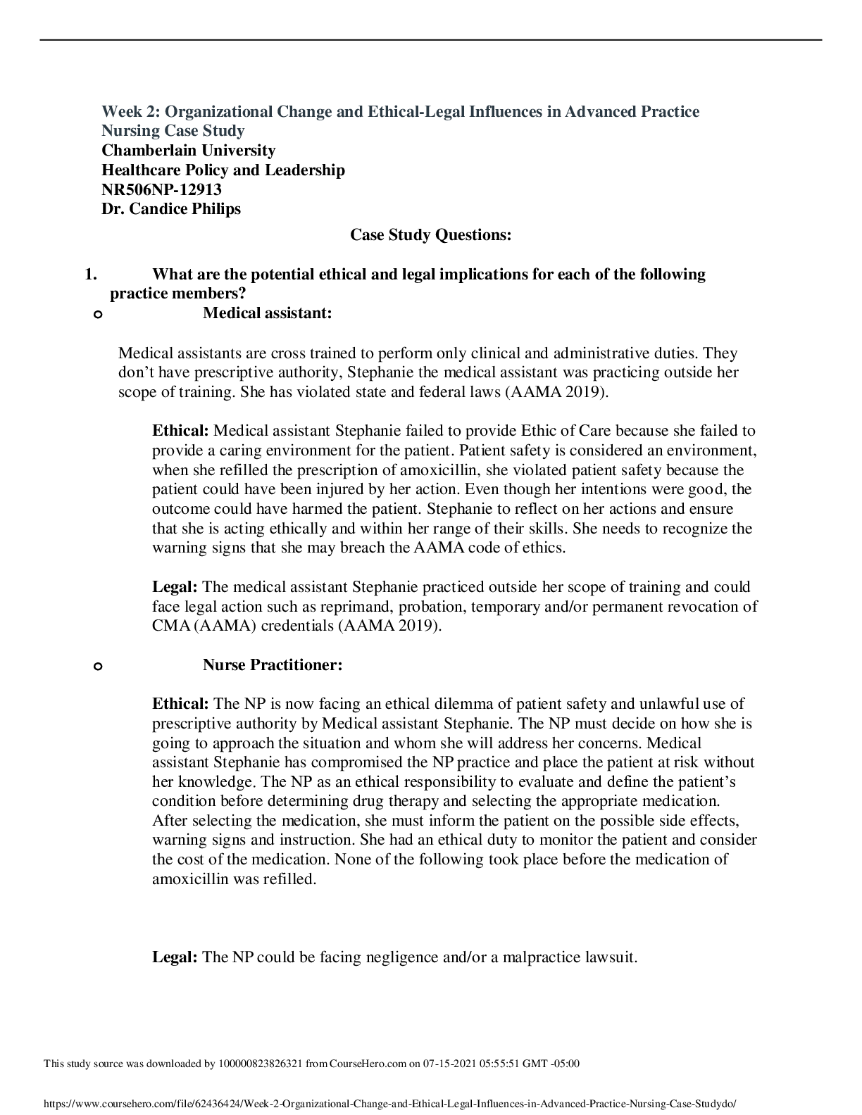 *NURSING > CASE STUDY > Week 2: Organizational Change and Ethical-Legal Influences in Advanced Practice Nursing Case Study Chamberlain University Healthcare Policy and Leadership NR506NP-12913 Dr. Candice Philips