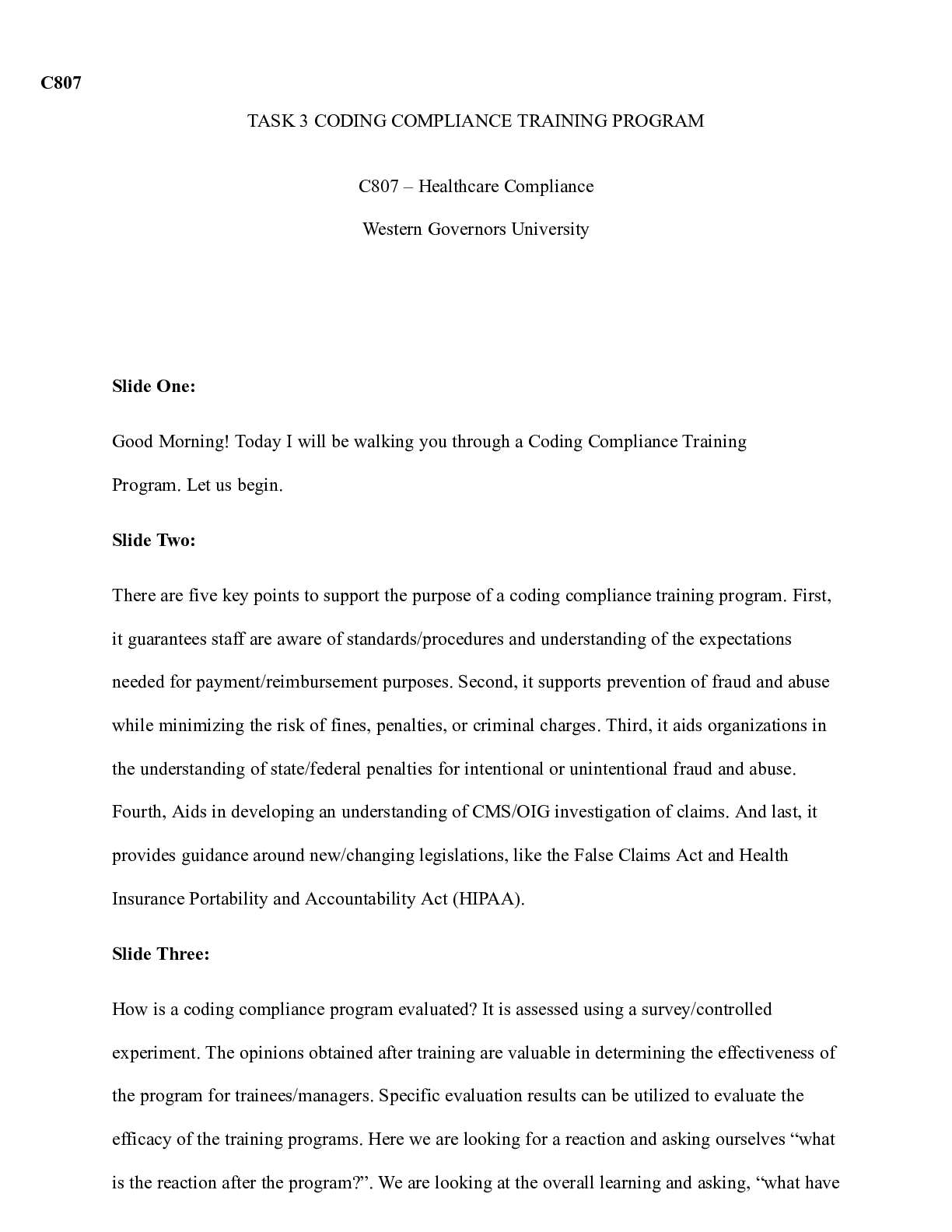 Business > CASE STUDY > TASK 3 PRESENTATION OUTLINE.docx C807 TASK 3 CODING COMPLIANCE TRAINING PROGRAM C807