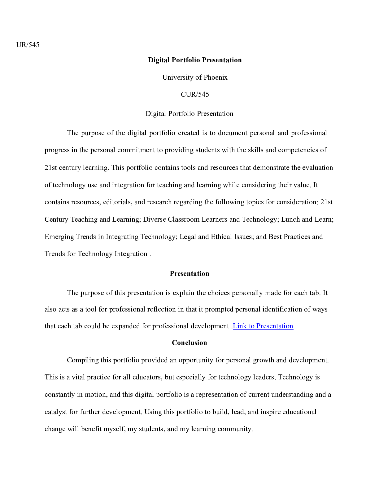Business > CASE STUDY > Digital Portfolio Presentation.docx UR/545 Digital Portfolio Presentation University of
