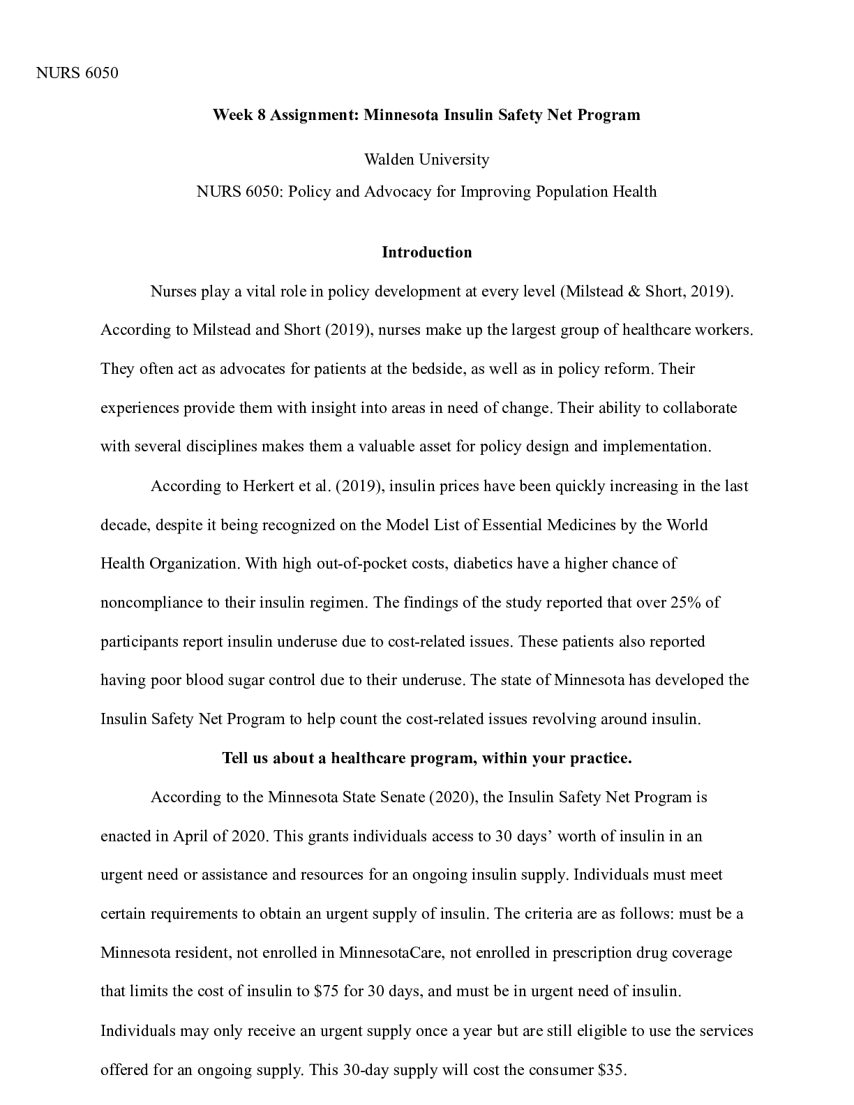 Business > CASE STUDY > WK8Assign.docx NURS 6050 Week 8 Assignment: Minnesota Insulin Safety Net Program Walden