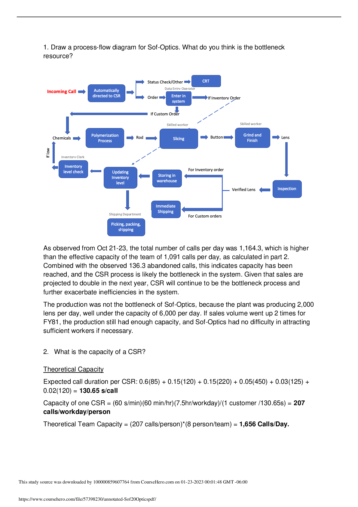 Management > CASE STUDY > Questions and Answers > annotated_Sof-Optics Inc. University of Alberta OM 422_ Draw a process-flow diagram for Sof-Optics. What do you think is the bottleneck resource? _3. Describe two possible interventions that could improve the operations at Sof-Optics Inc.
