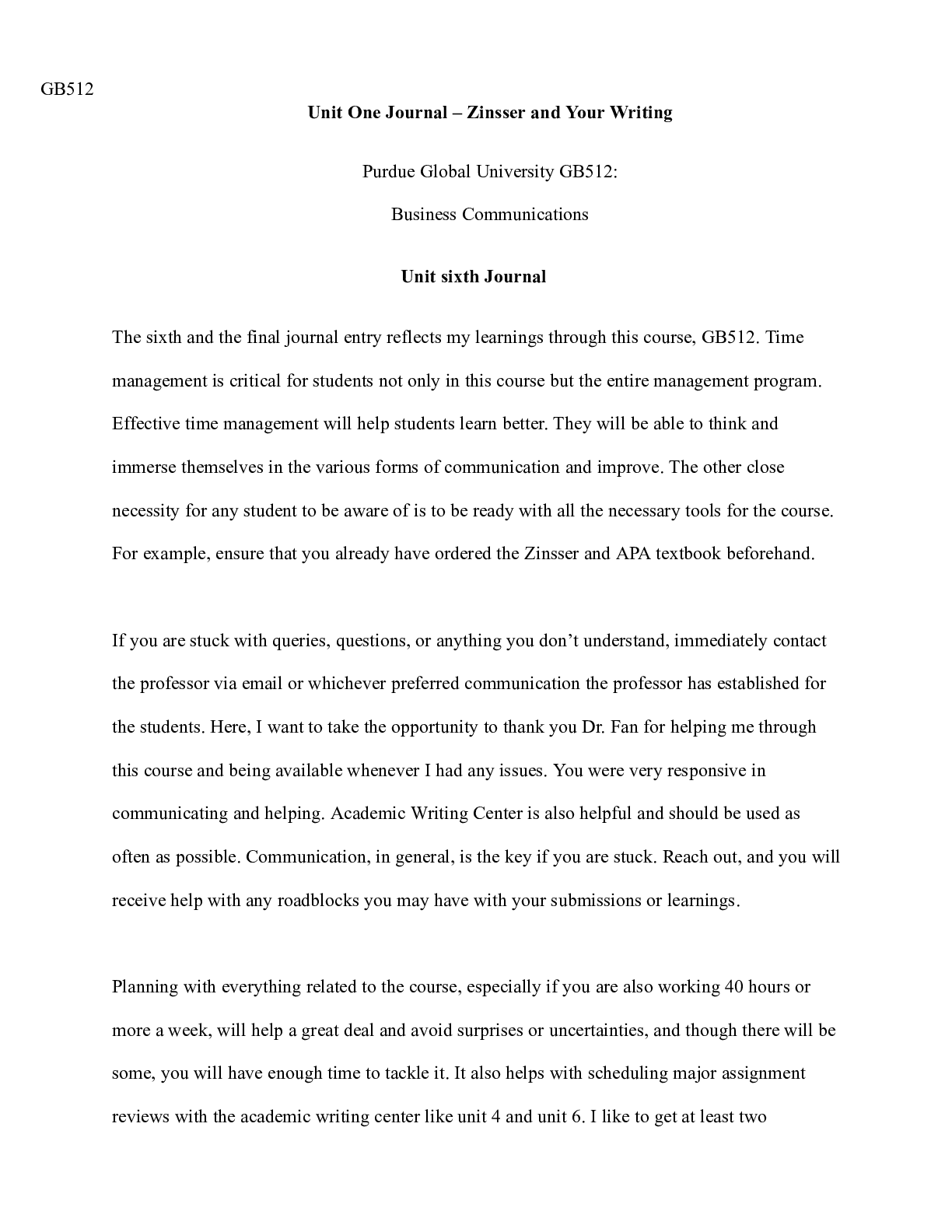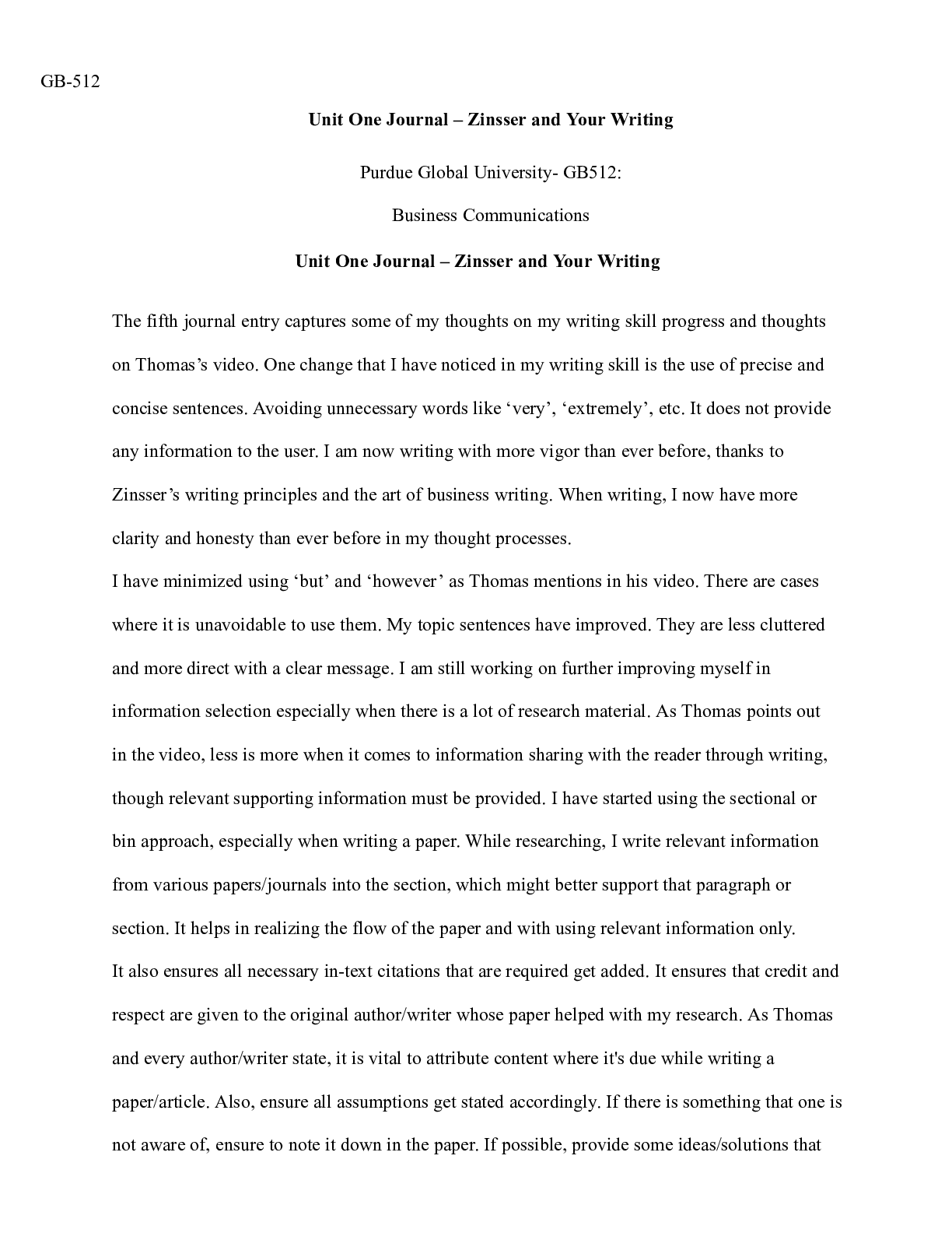 Business > CASE STUDY > GB512 Unit5 Journal.docx GB-512 Unit One Journal – Zinsser and Your Writing Purdue Gl