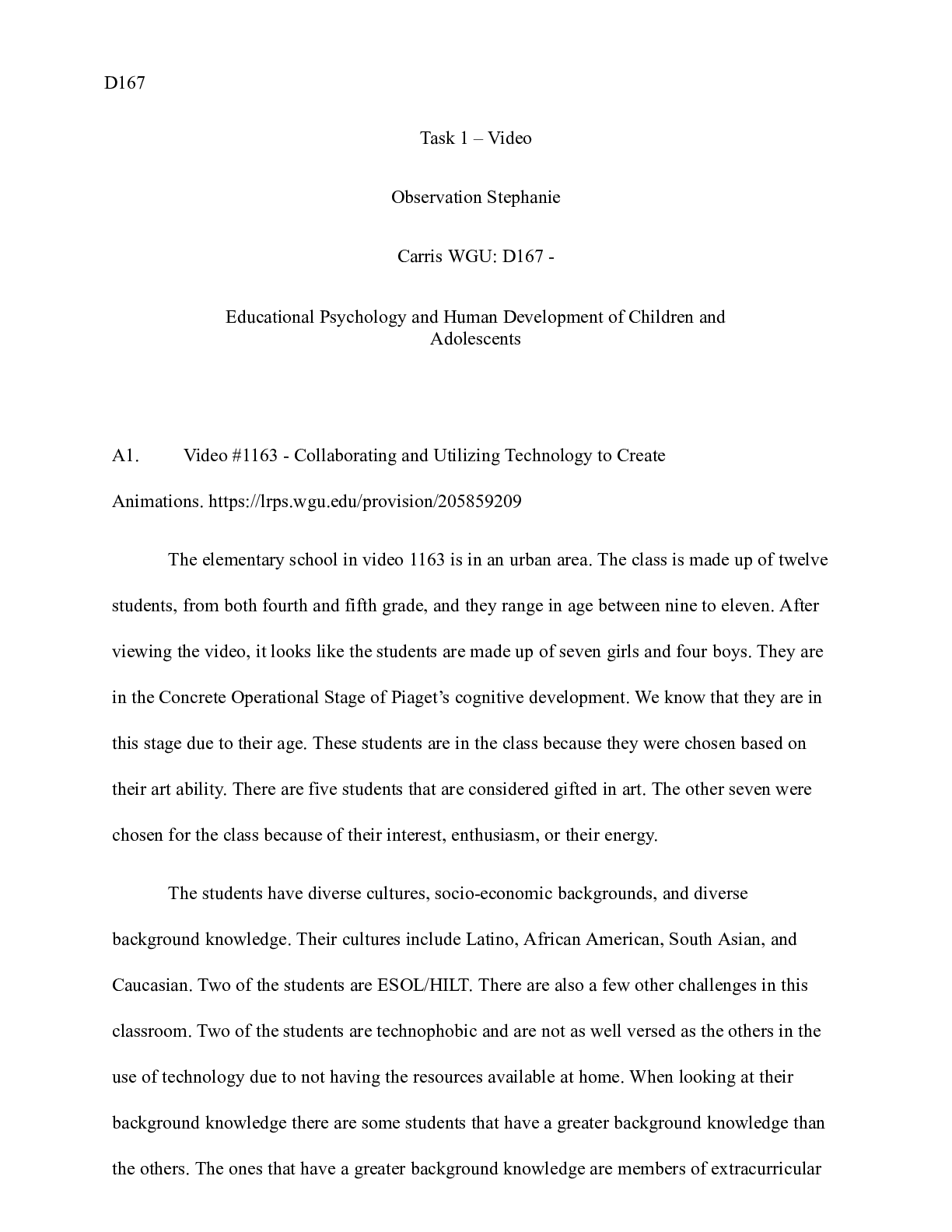 Business > CASE STUDY > PsychTask1.docx D167 Task 1 – Video Observation Stephanie Carris WGU: D167 - Educatio