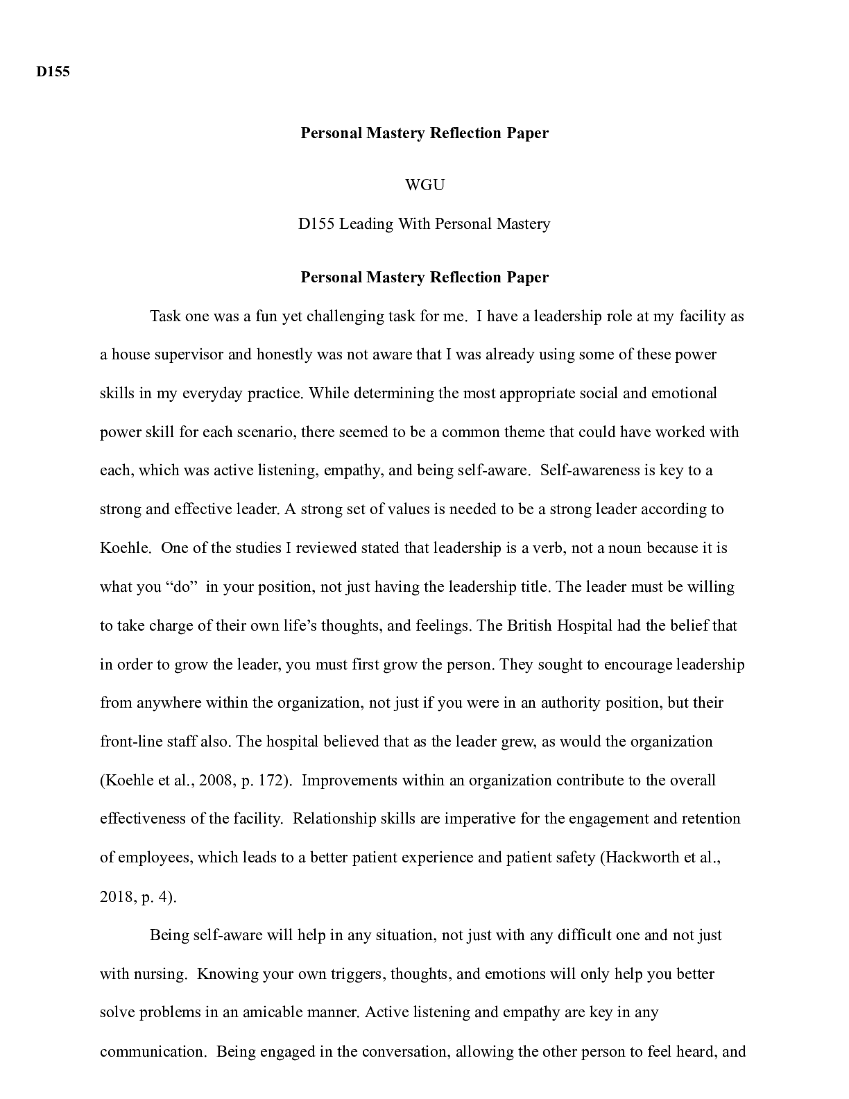 Business > CASE STUDY > task2 d155 revised.docx D155 Personal Mastery Reflection Paper WGU D155 Leading With P
