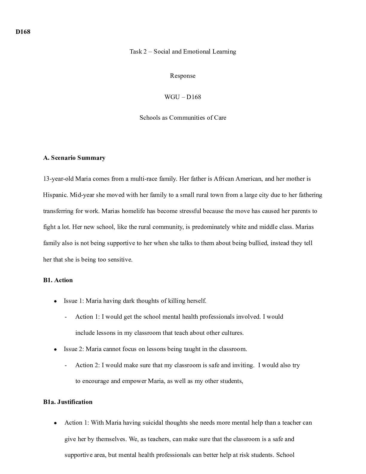 Business > CASE STUDY > Task2.3.8.21.docx D168 Task 2 – Social and Emotional Learning Response WGU – D168