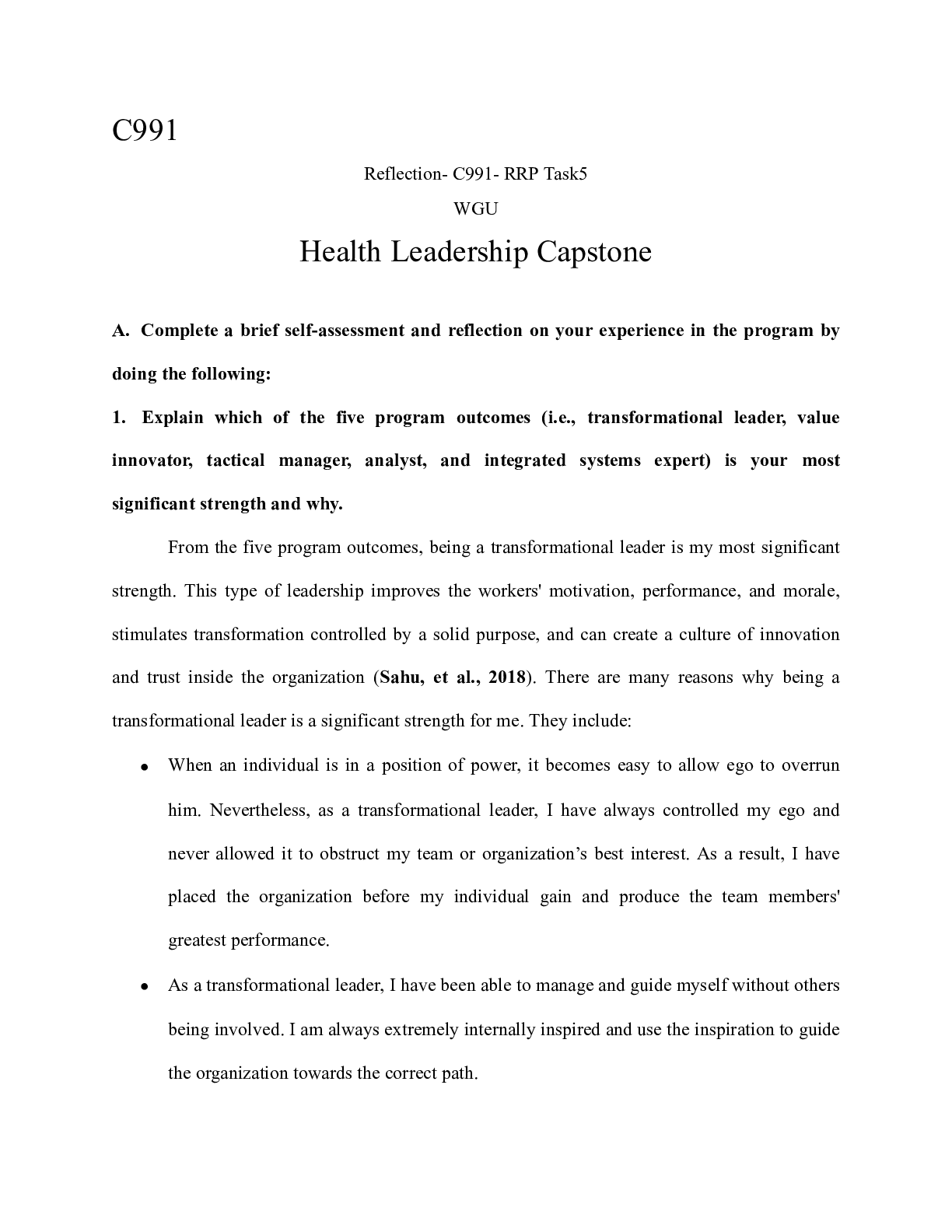 Business > CASE STUDY > C991_Relflection__Task5_.docx C991 Reflection- C991- RRP Task5 WGU Health Leadership C