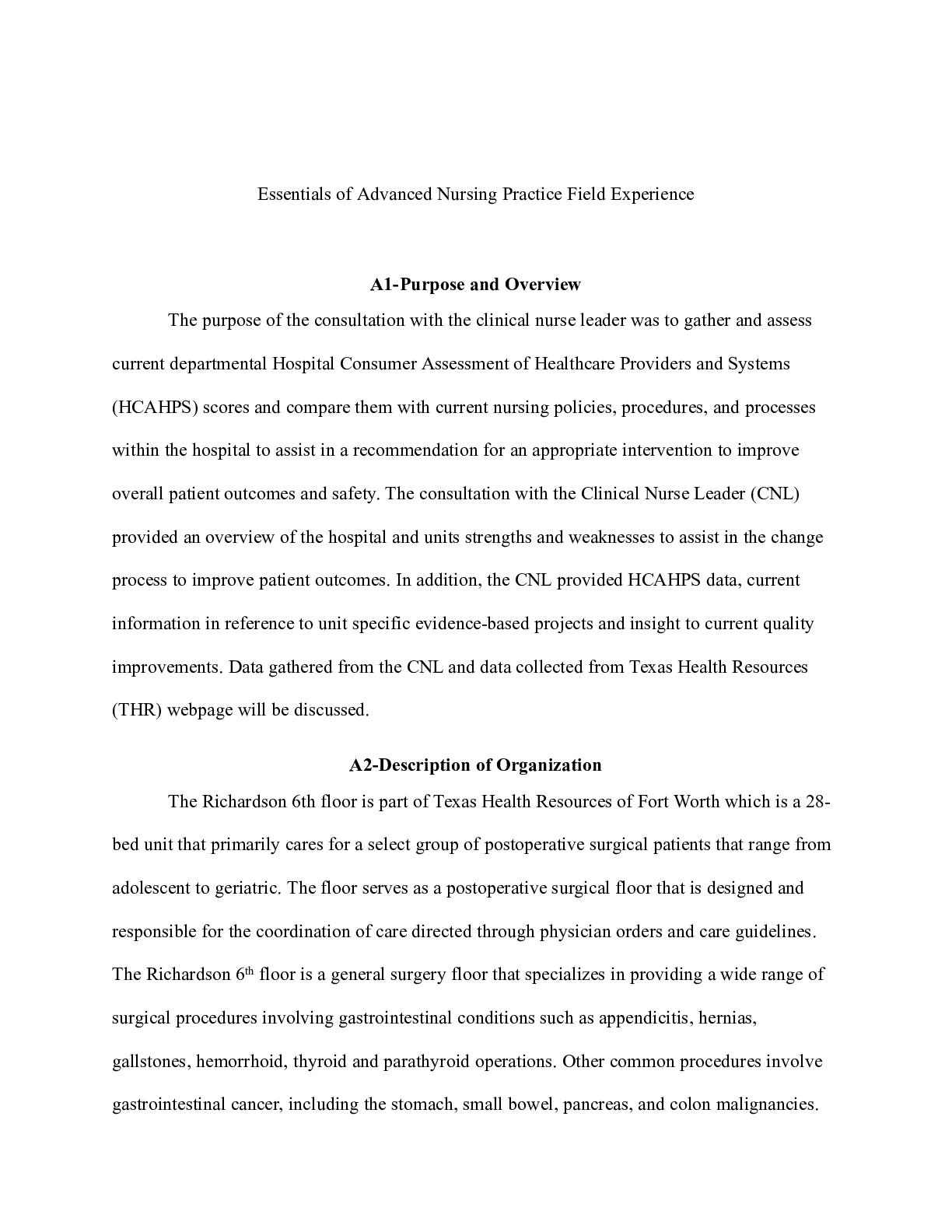 Business > CASE STUDY > Essentials of Advanced Nursing Practice Field Experience Essentials of Advanced Nursing