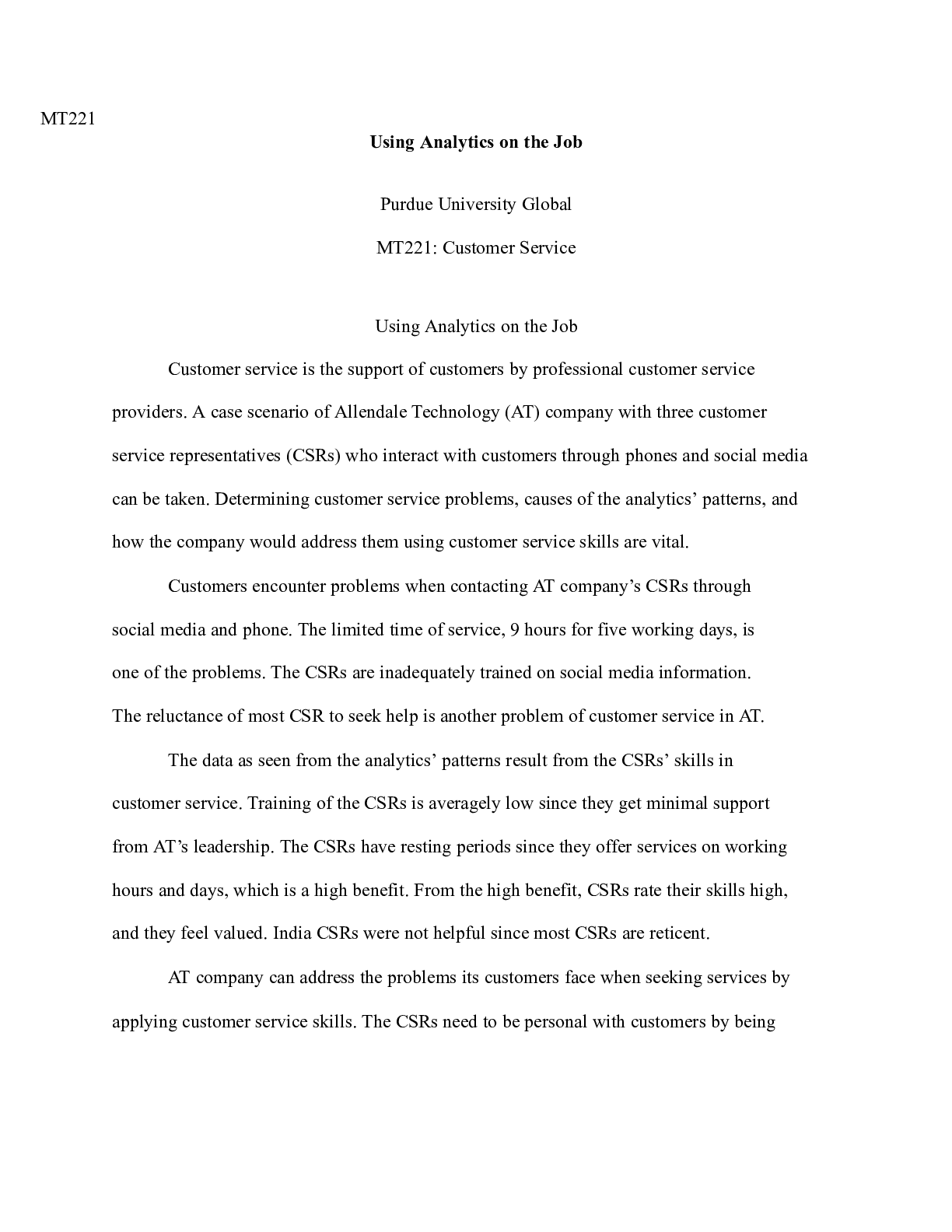 Business > CASE STUDY > Assignment Unit06.docx MT221 Using Analytics on the Job Purdue University Global MT221: