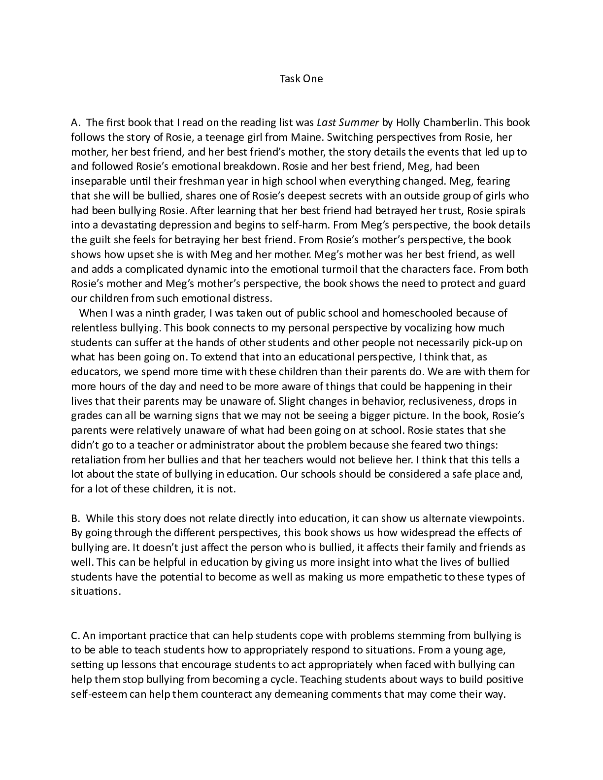 Business > CASE STUDY > STA1 Task One.docx Task One A. The first book that I read on the reading list was Last