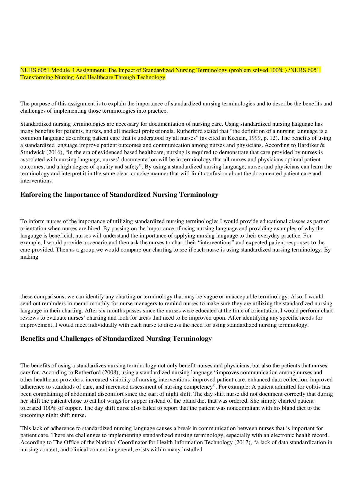 Health Care > CASE STUDY > NURS 6051 Module 3 Assignment: The Impact of Standardized Nursing Terminology (problem solved 100% ) /NURS 6051 Transforming Nursing And Healthcare Through Technology