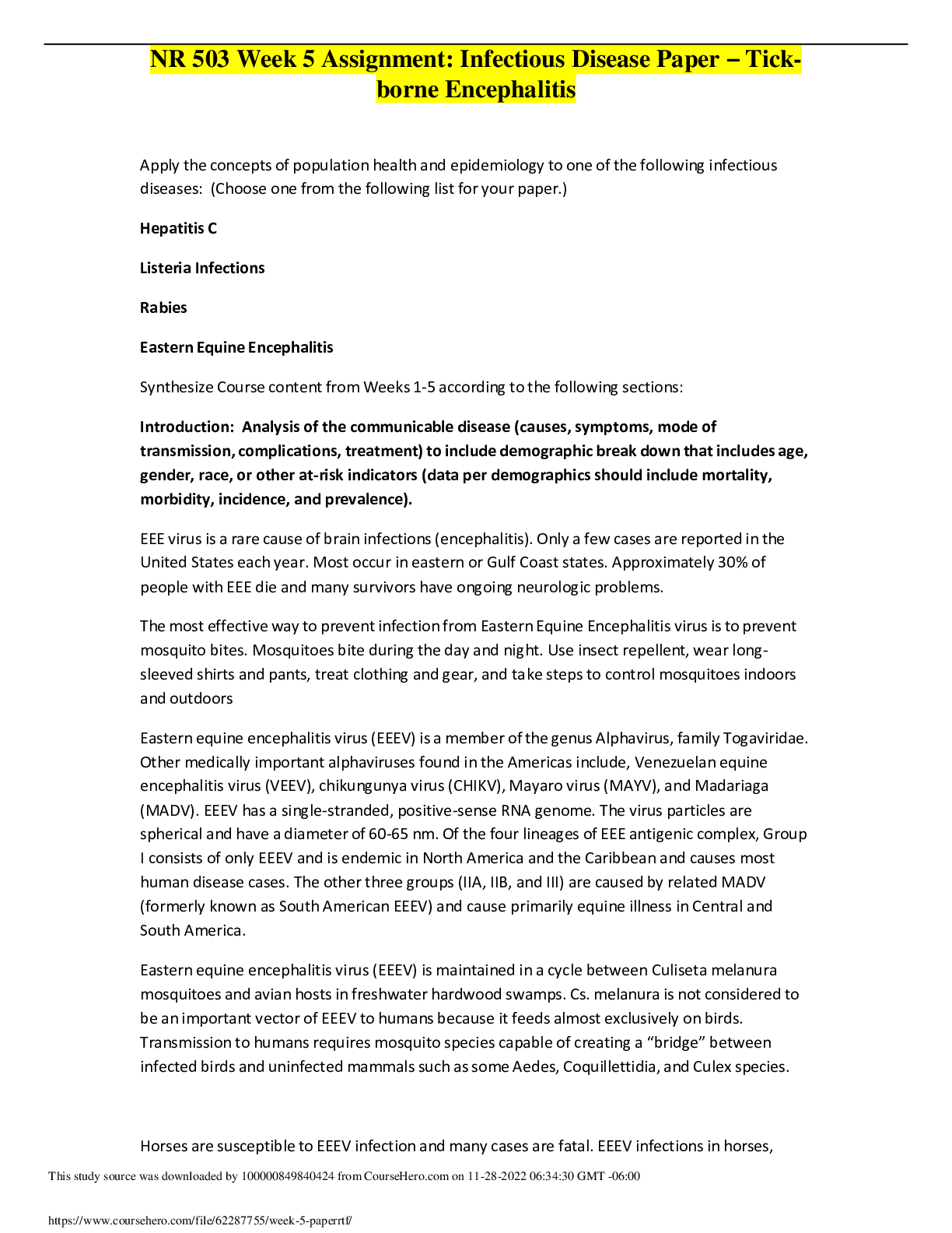*NURSING > CASE STUDY > NR 503 Week 5 Assignment: Infectious Disease Paper – Tick-borne Encephalitis