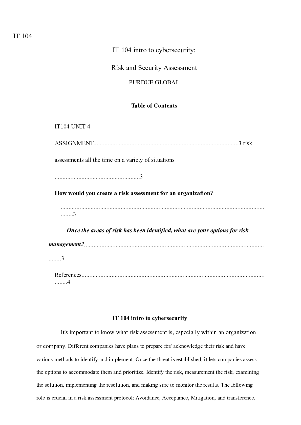 Business > CASE STUDY > IT104 Unit 4 Assignment.docx IT 104 IT 104 intro to cybersecurity: Risk and Security