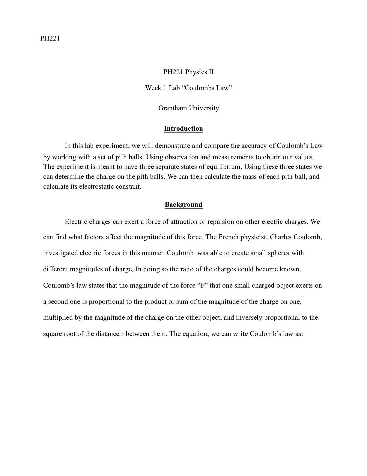 Business > CASE STUDY > PH221W1Lab.docx PH221 PH221 Physics II Week 1 Lab œCoulombs Law Grantham Universit
