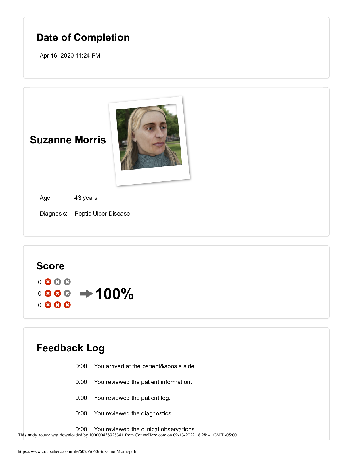 Health Care > vSim For Nursing > Suzanne Morris Vsim Feedback Log