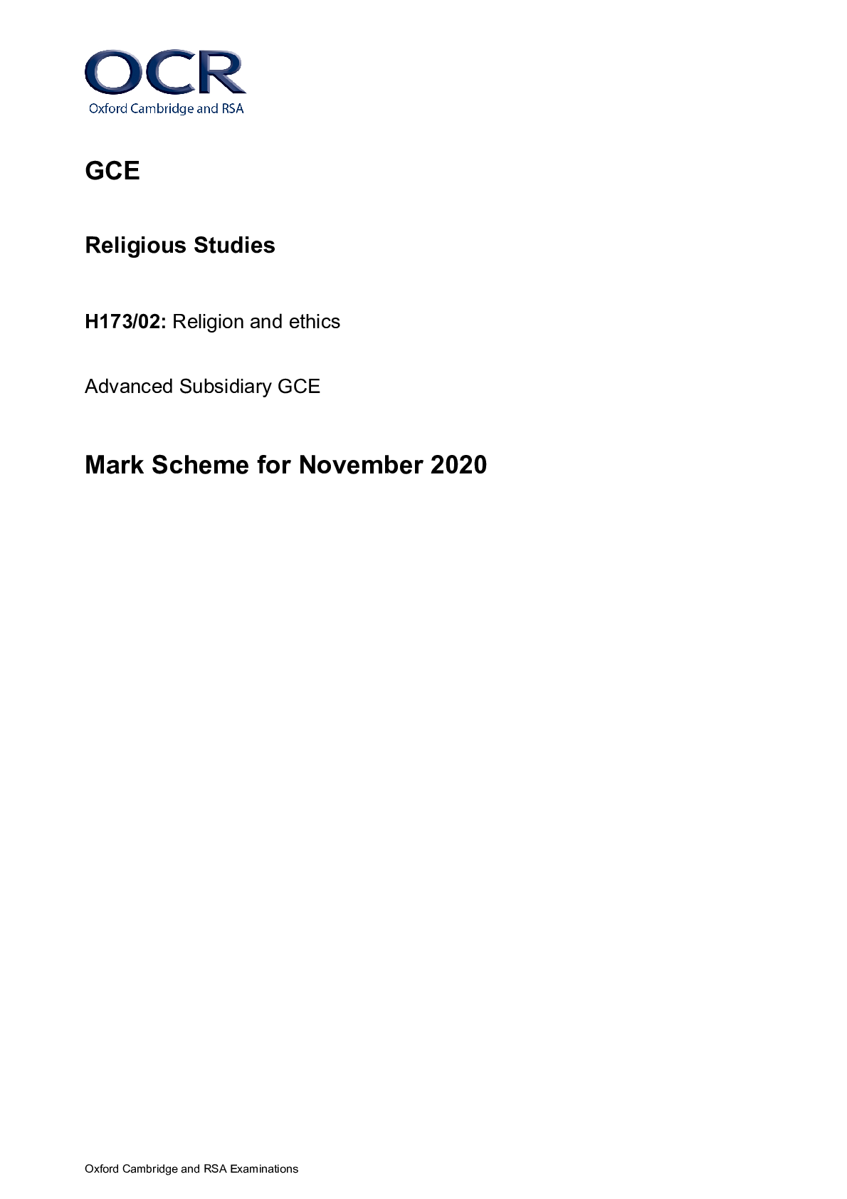 Religious Studies > MARK SCHEMES > GCE Religious Studies H573/02: Religion and ethics Advanced GCE Mark Scheme for November 2020