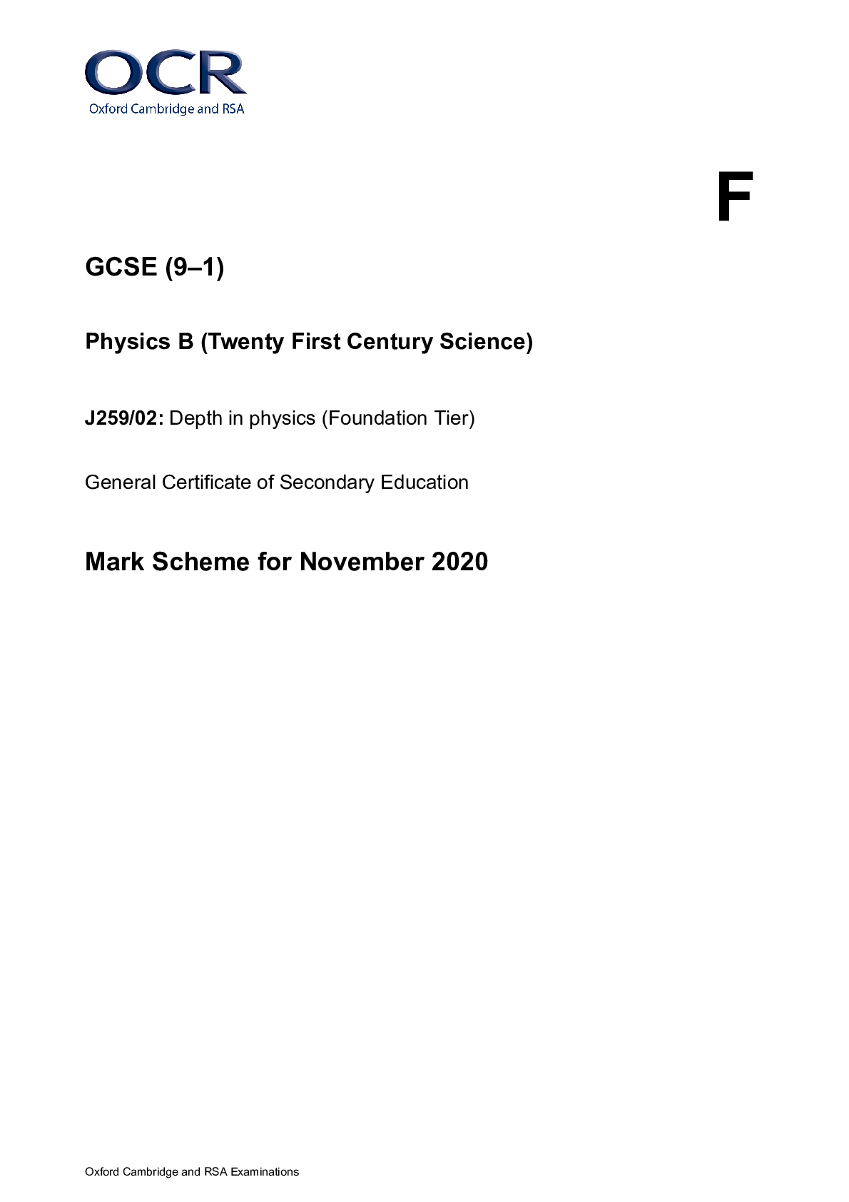 Biology > MARK SCHEMES > GCSE (9–1) Physics B (Twenty First Century Science) J259/02: Depth in physics (Foundation Tier) General Certificate of Secondary Education Mark Scheme for November 2020