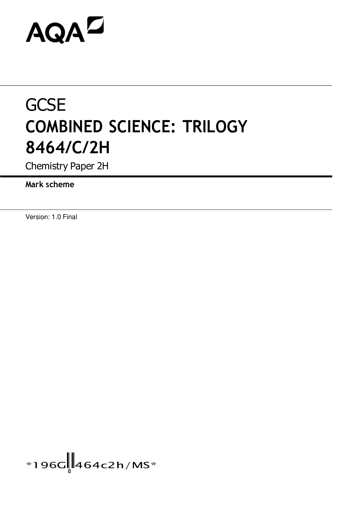 Chemistry > AQA > AQA GCSE COMBINED SCIENCE: TRILOGY 8464/C/1H Chemistry Paper 1H Mark scheme June 2020
