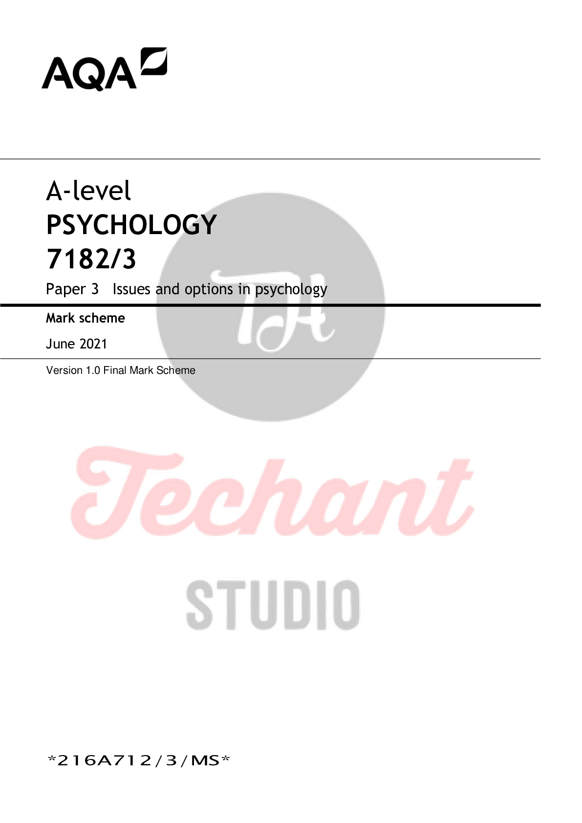 Psychology > AQA > AQA A-level PSYCHOLOGY 7182/3 Paper 3 Issues and options in psychology Mark scheme June 2021 Version 1.0 Final Mark Scheme