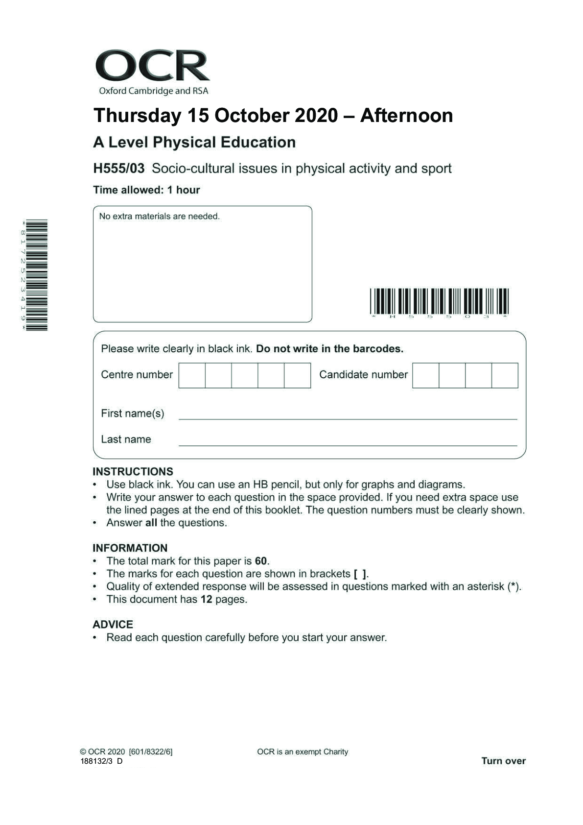 Physical Education > Higher Education > A Level Physical Education_H555/03 Question Paper Nov 2020 | Socio-cultural Issues in Physical Activity and Sport
