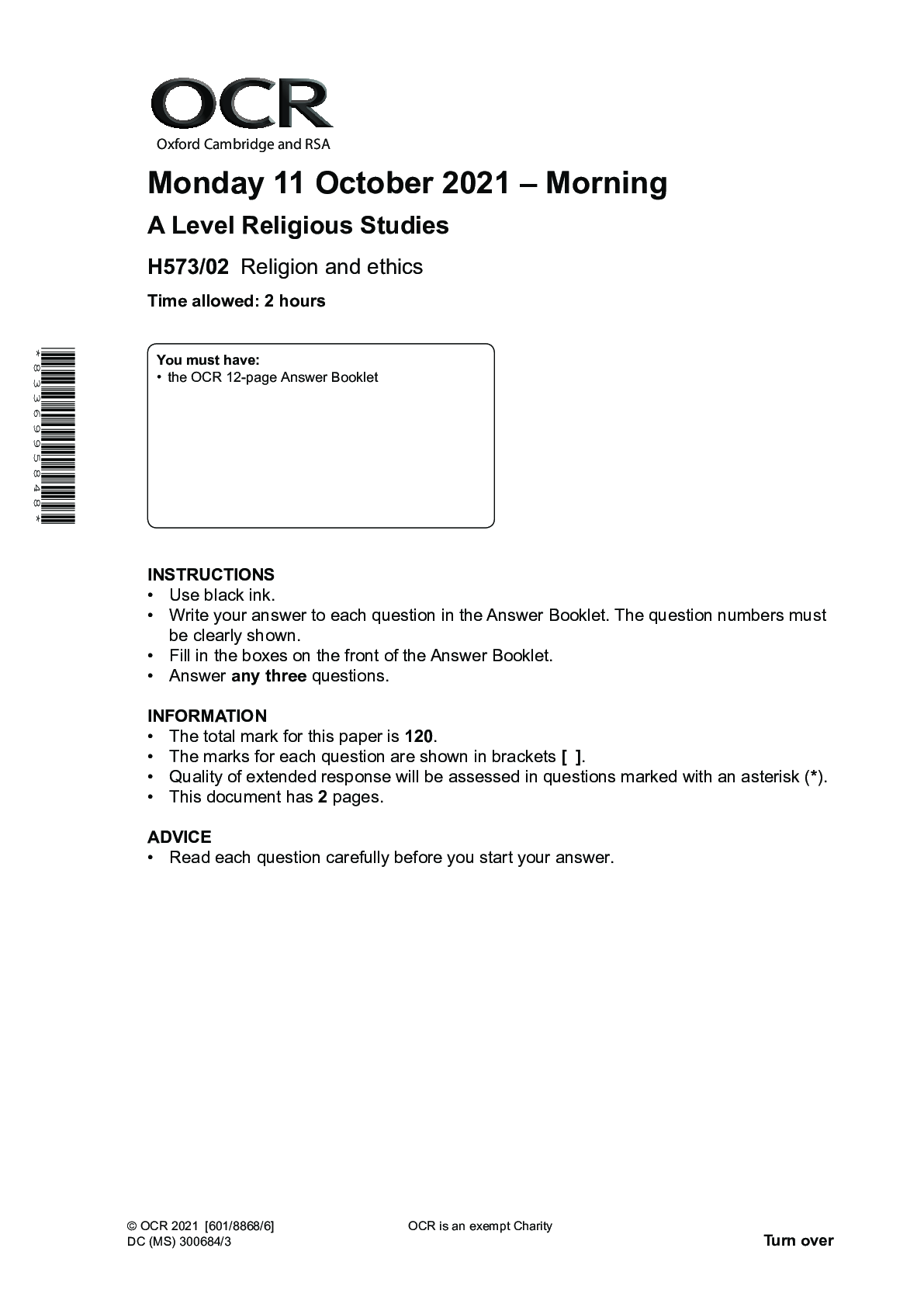 Religious Studies > Higher Education > A Level Religious Studies _H573/02 Question Paper Oct 2021 | Religion and Ethics