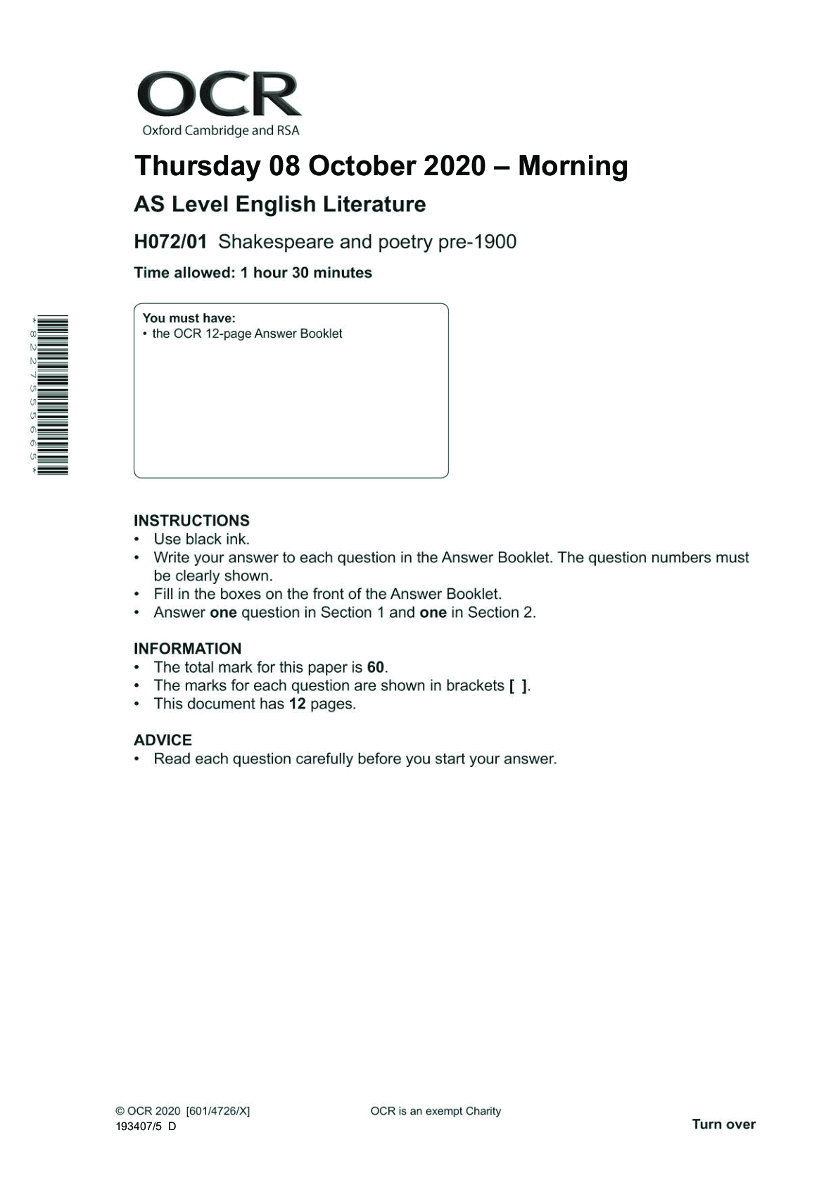English > Higher Education > AS Level English Literature_H072/01 Question Paper Nov 2020 | Shakespeare and poetry pre-1900