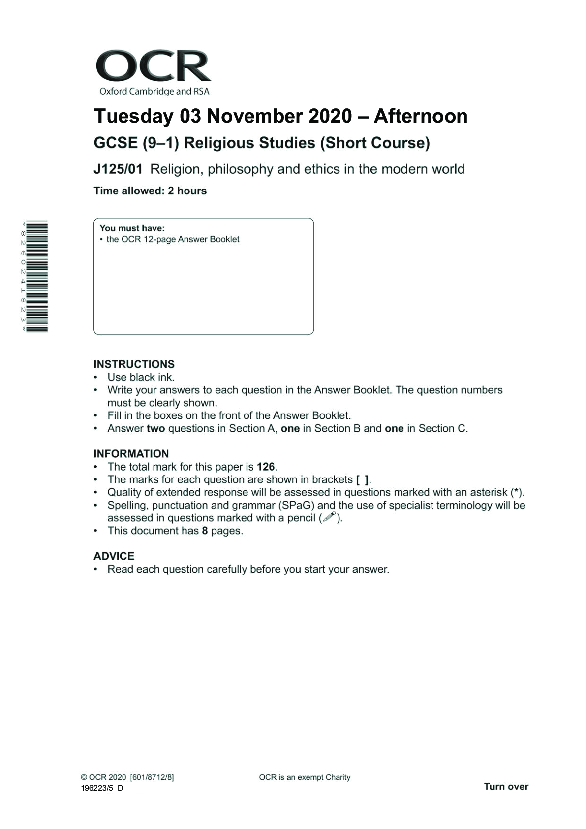 Religious Studies > Higher Education > GCSE (9-1) Religious Studies (Short Course)_J125/01 Question Paper Nov 2020 | Religion, Philosophy and Ethics in the Modern World