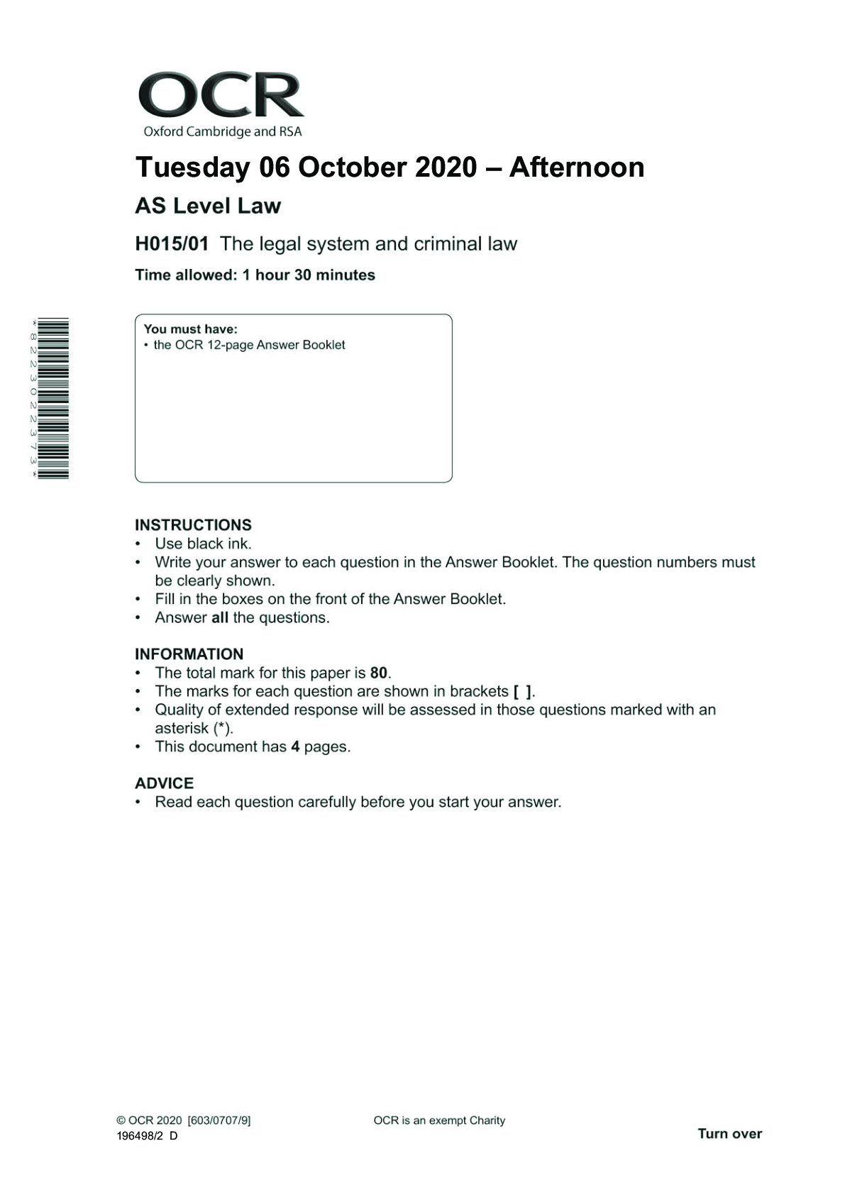 Law > Higher Education > AS Level Law_H015/01 Question Paper Nov 2020 | The Legal System and Criminal law