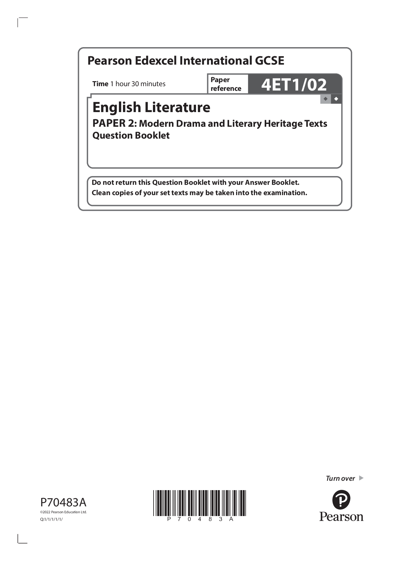 English Literature > Edexcel > 2022 pearson june booklet + mark scheme Edexcel International GCSE 4ET1/02 English Literature PAPER 2: Modern Drama and Literary Heritage Texts Question Booklet