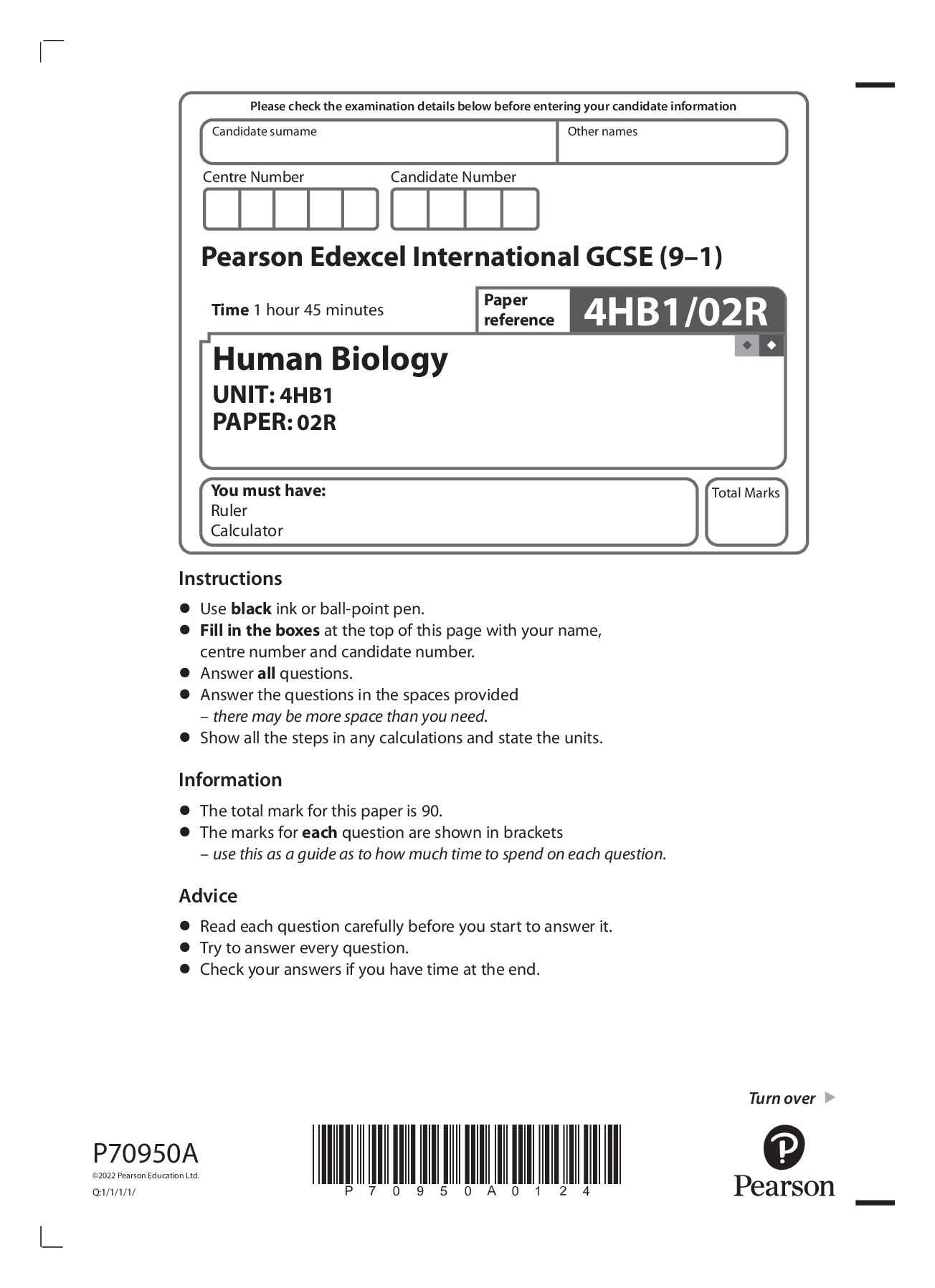 Biology > Edexcel > 2022 pearson june booklet + mark scheme Edexcel International GCSE (9–1) 4HB1/01 Human Biology UNIT: 4HB1 PAPER: 01