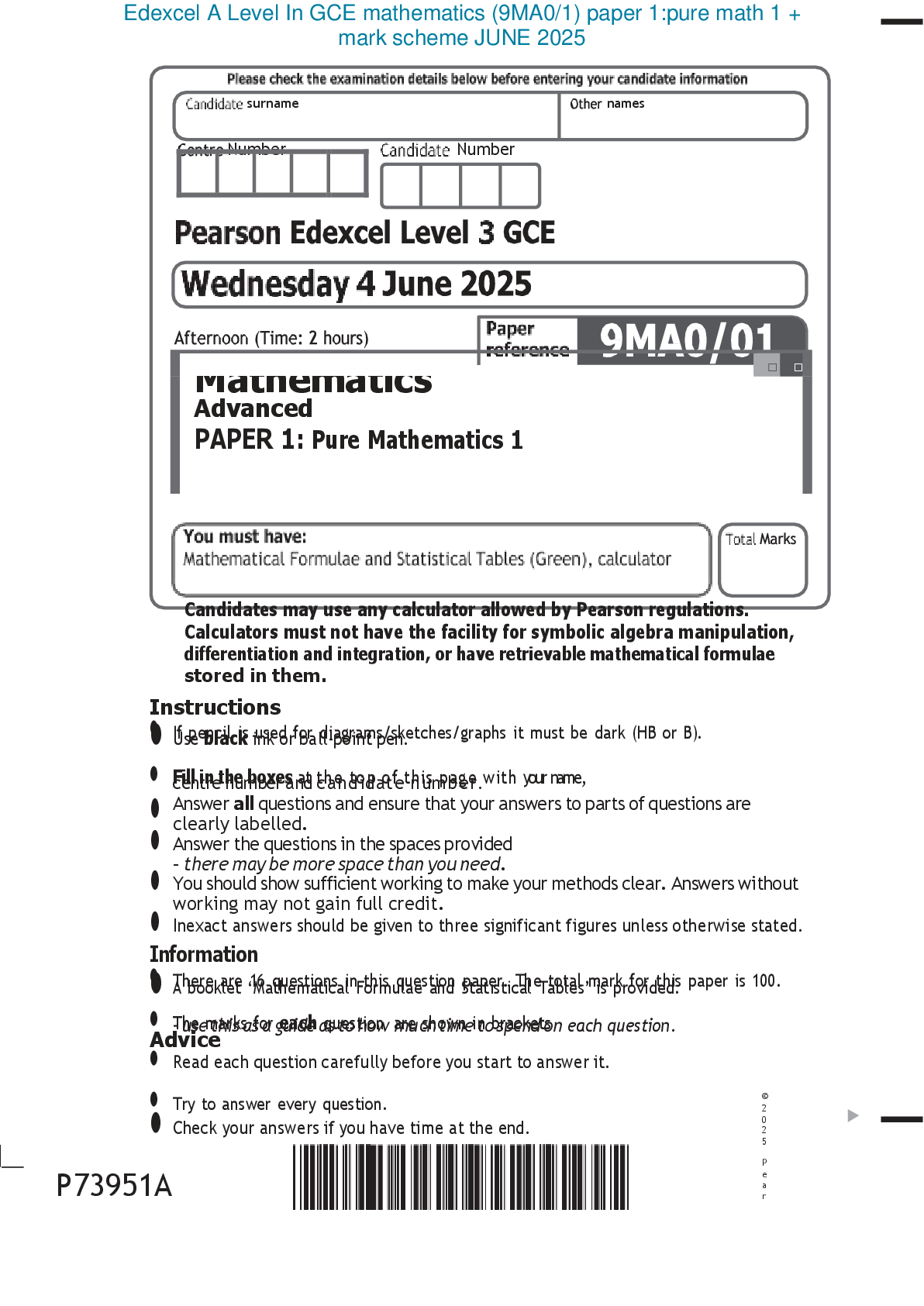 Mathematics > Edexcel > Edexcel A Level In GCE mathematics (9MA0/1) paper 1:pure math 1 + mark scheme JUNE 2025