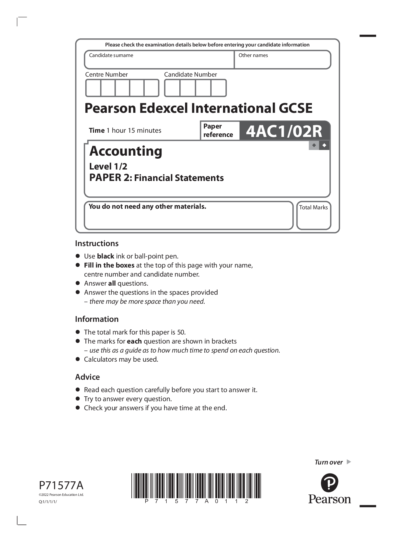 Financial Accounting > Edexcel > 2022 pearson june booklet + mark scheme Edexcel International GCSE 4AC1/02 Accounting Level 1/2 PAPER 2: Financial Statements