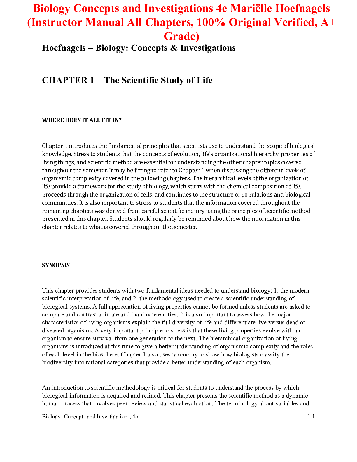 Biology > INSTRUCTOR MANUALS > Instructor's Manual for Biology Concepts and Investigations 4th Edition By Mariëlle Hoefnagels (All Chapters, 100% Original Verified, A+ Grade)