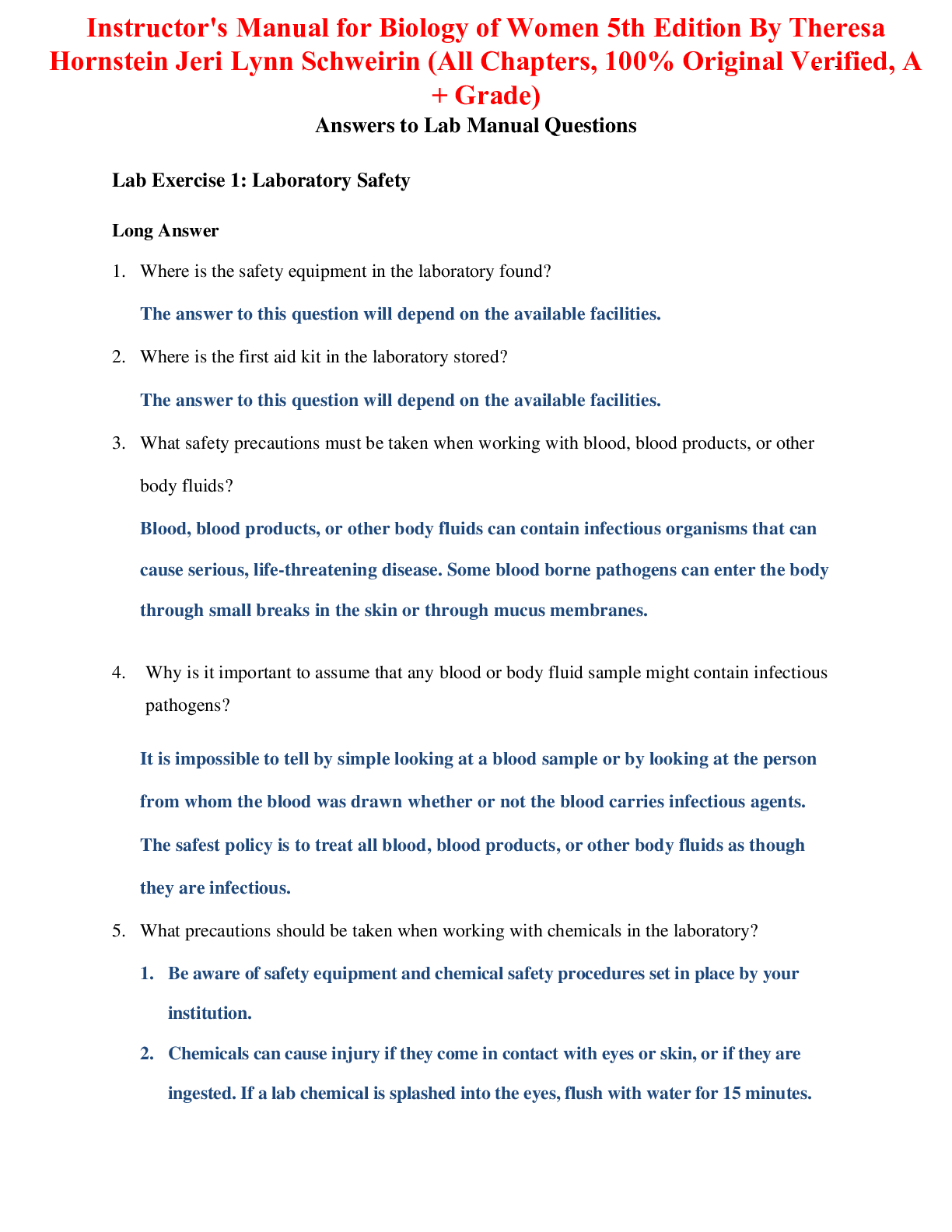 Biology > INSTRUCTOR MANUALS > Instructor's Manual for Biology of Women 5th Edition By Theresa Hornstein Jeri Lynn Schweirin (All Chapters, 100% Original Verified, A+ Grade)