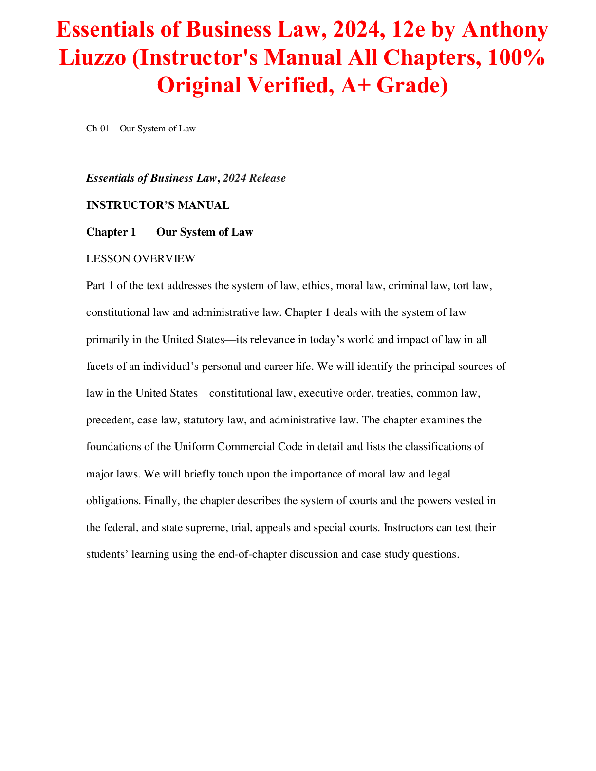 Business Law > INSTRUCTOR MANUALS > Instructor's Manual For Essentials of Business Law (2024) 12th Edition By Anthony Liuzzo (All Chapters, 100% Original Verified, A+ Grade)