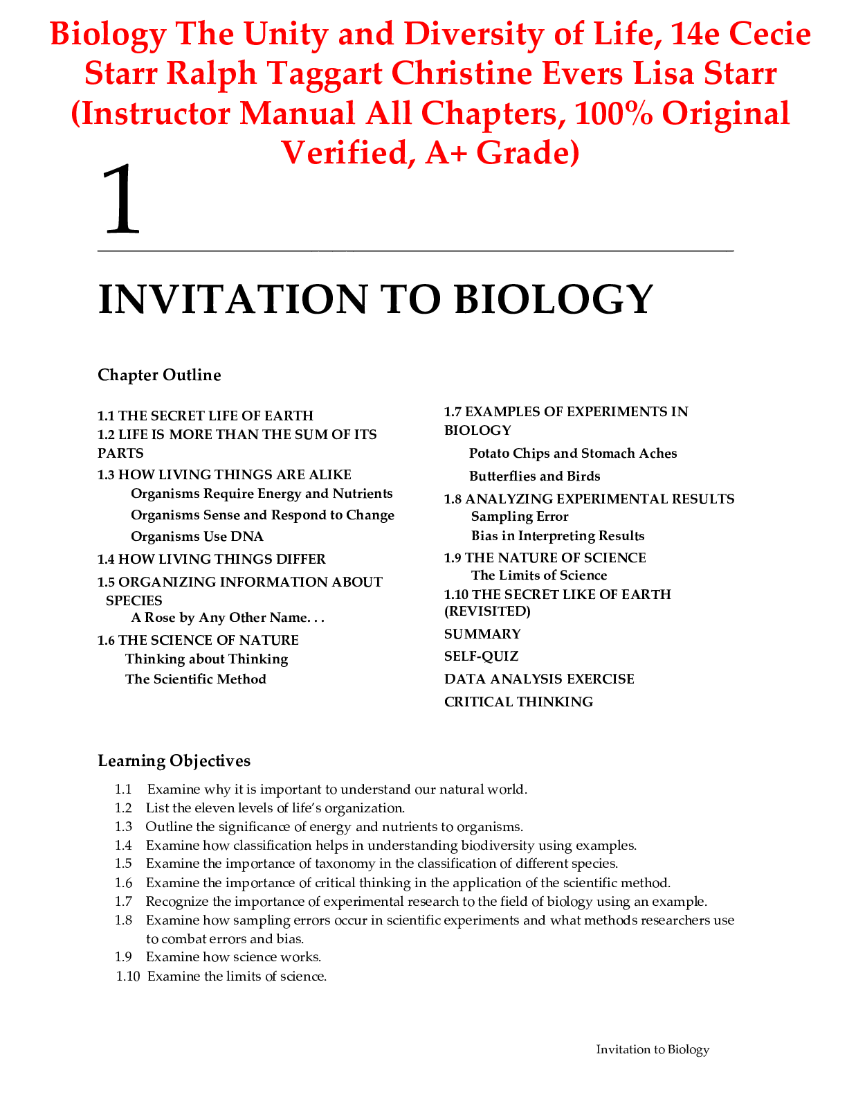 Biology > INSTRUCTOR MANUALS > Instructor's Manual for Biology The Unity and Diversity of Life 14th Edition By Cecie Starr, Ralph Taggart, Christine Evers, Lisa Starr (All Chapters, 100% Original Verified, A+ Grade)