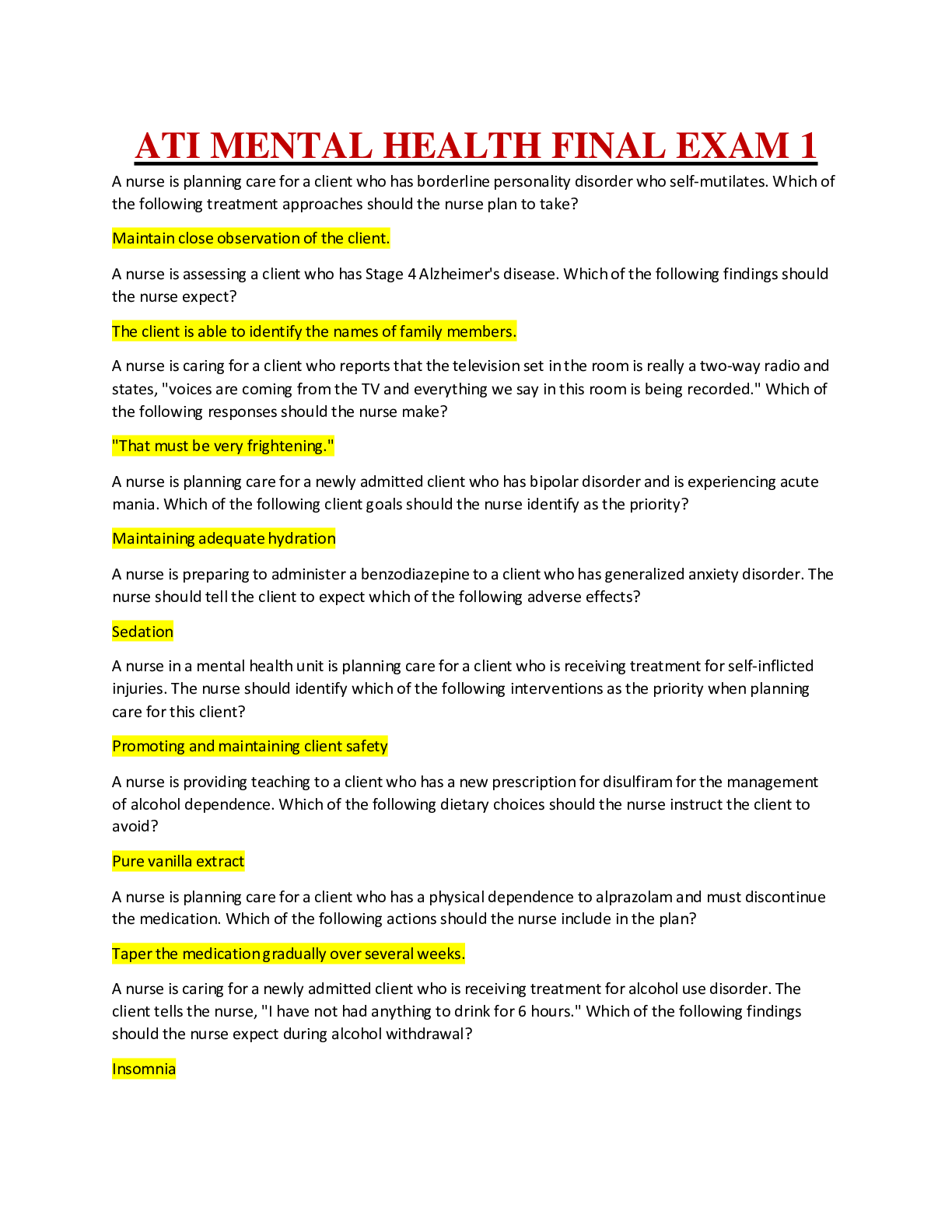 Health Care > ATI > ATI MENTAL HEALTH FINAL EXAM 1 2022/2023 LATEST UPDATE.