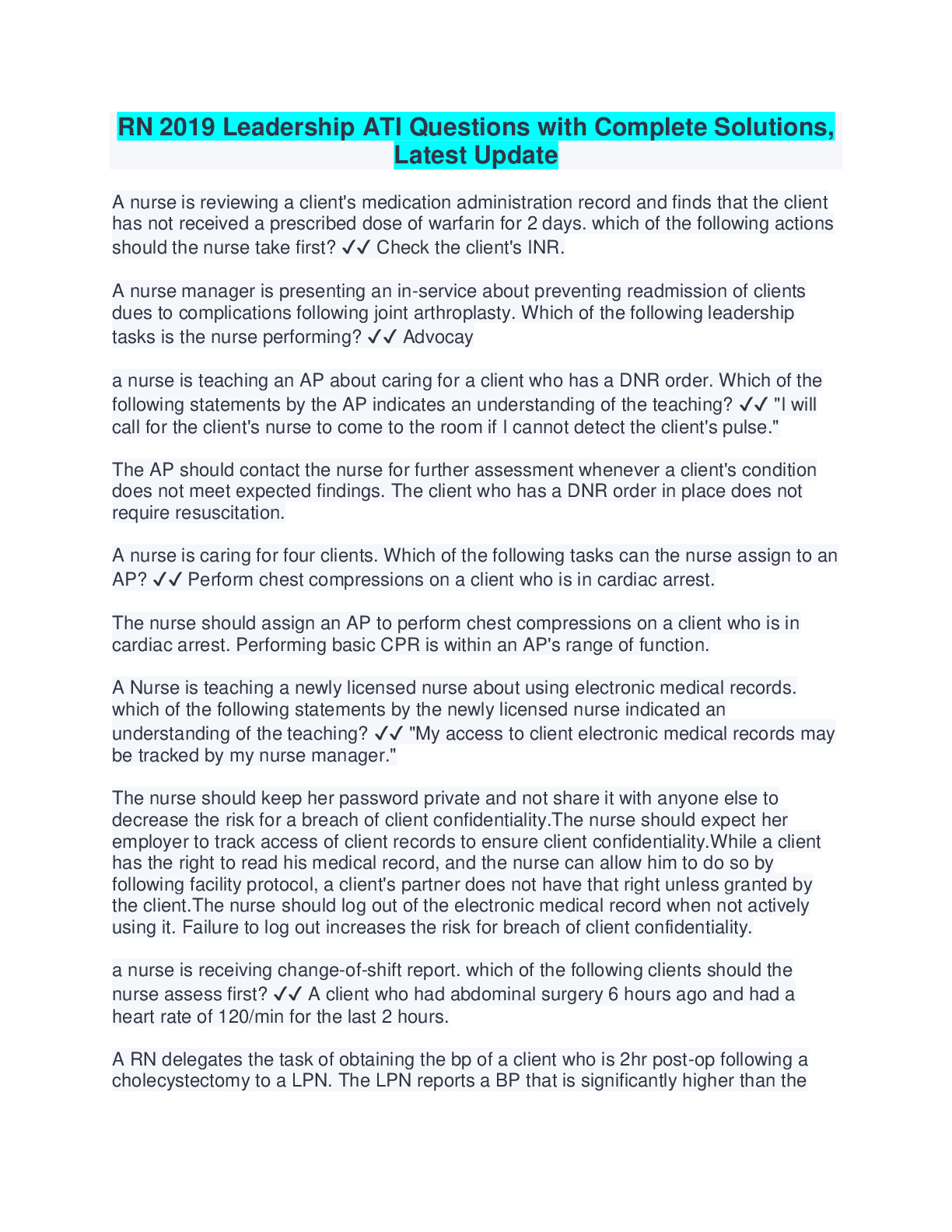 *NURSING > Other Study Resources. > RN 2019 Leadership ATI Questions with Complete Solutions, Latest Update