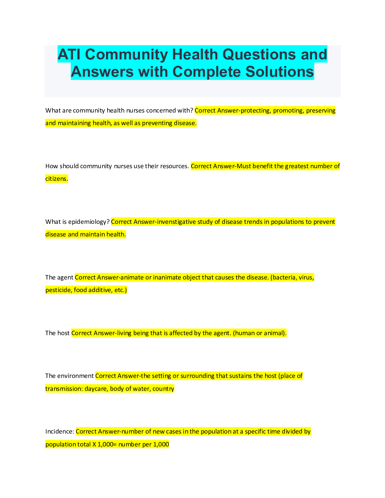 *NURSING > Other Study Resources. > ATI Community Health Questions and Answers with Complete Solutions