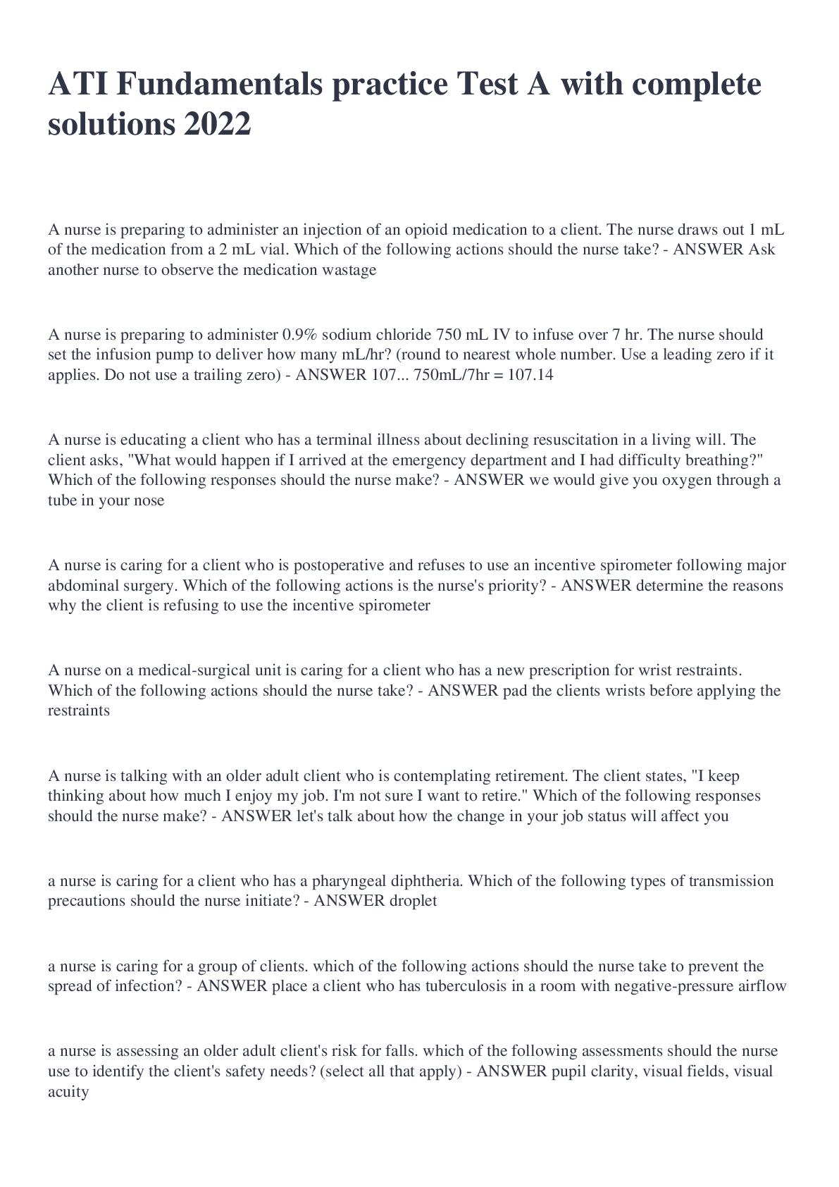Health Care > Other Study Resources. > ATI Fundamentals practice Test A with complete solutions 2022