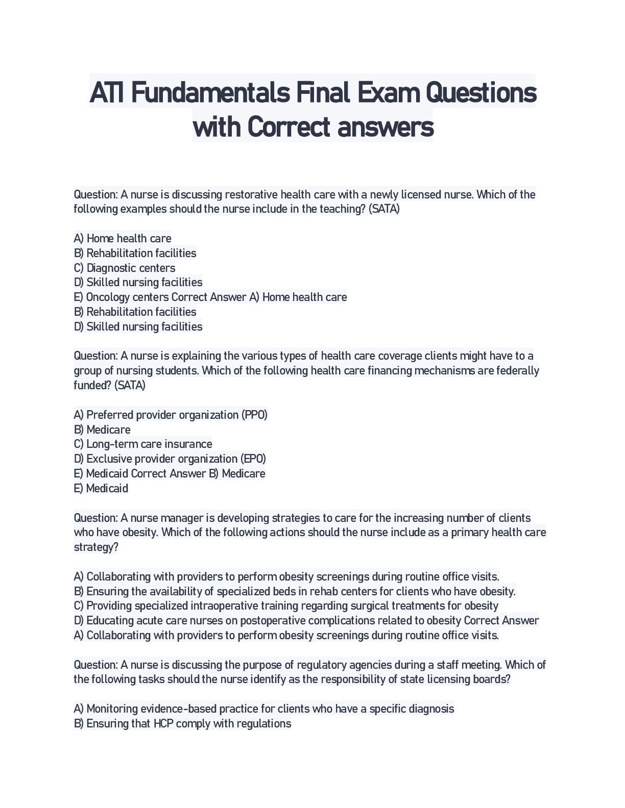 *NURSING > Other Study Resources. > ATI Fundamentals Final Exam Questions with Correct answers