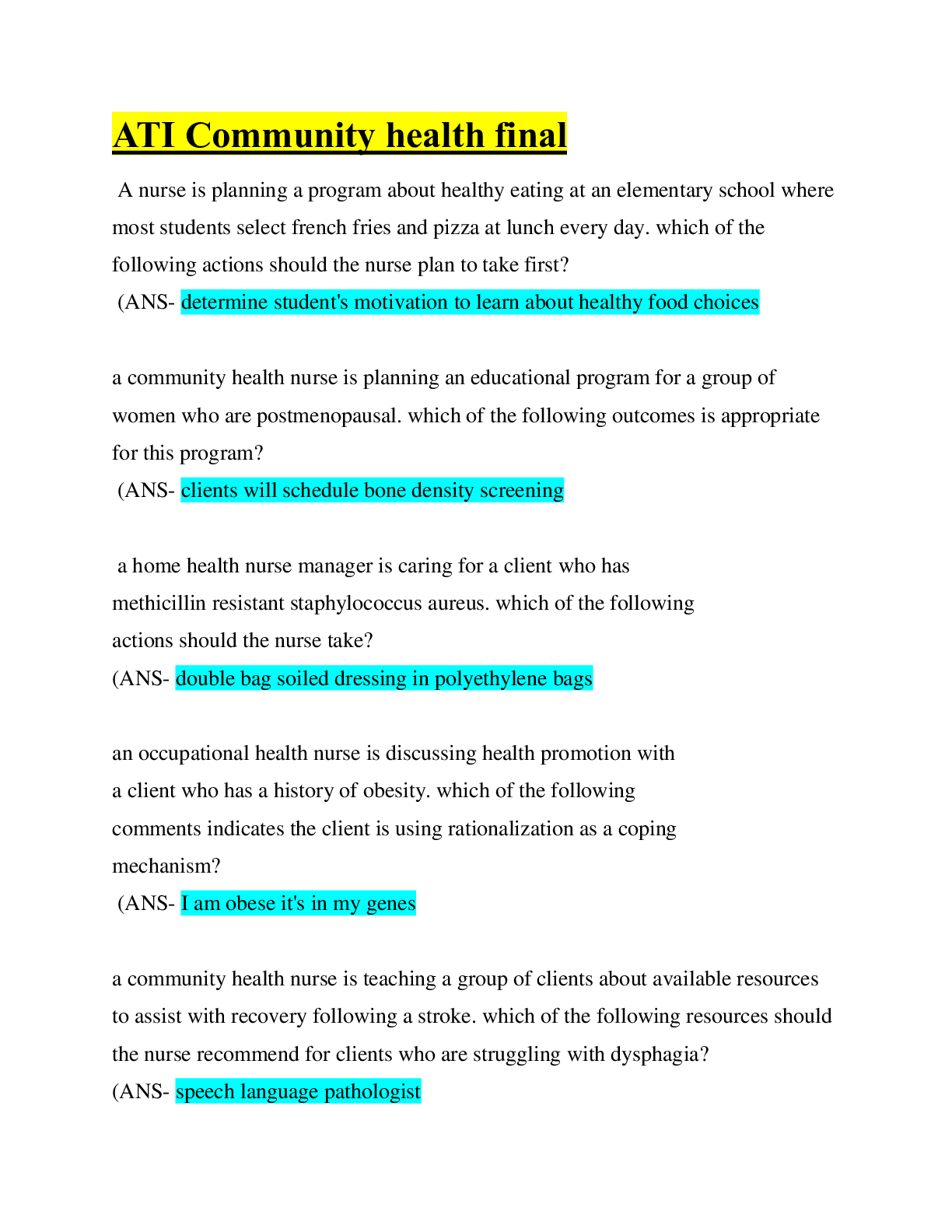 Health Care > Other Study Resources. > ATI Community health final/Latest Updated/ Questions & Answers