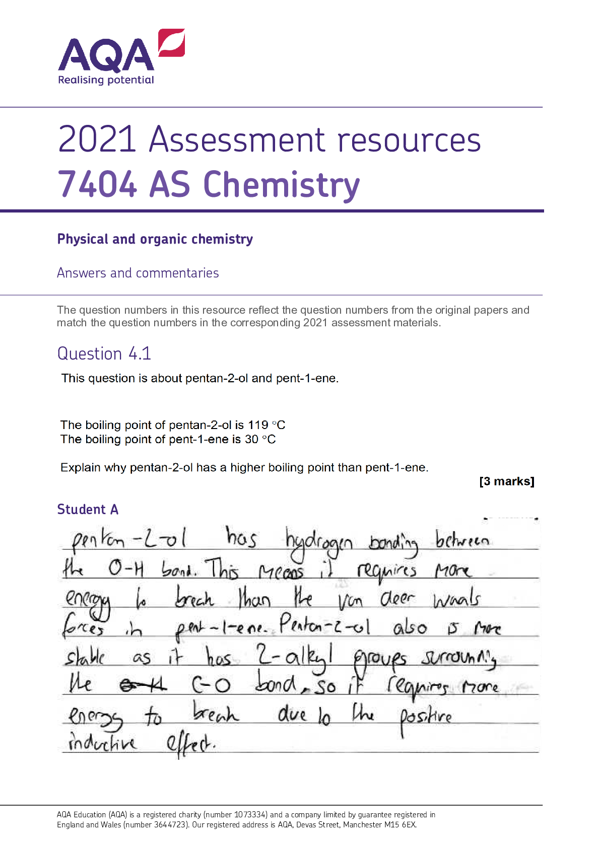 Chemistry > AS Mark Scheme > AQA AS Chemistry 7404 Physical and Organic Chemistry ANSWERS AND COMMENTARIES. 2021 Assessment resources