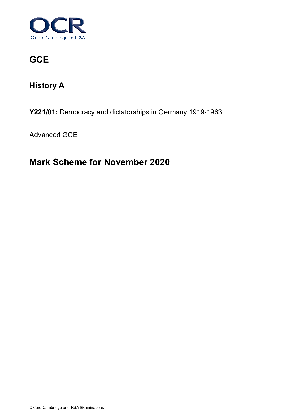 History > AS Mark Scheme > GCE History A Y221/01: Democracy and dictatorships in Germany 1919-1963 Advanced GCE Mark Scheme for November 2020