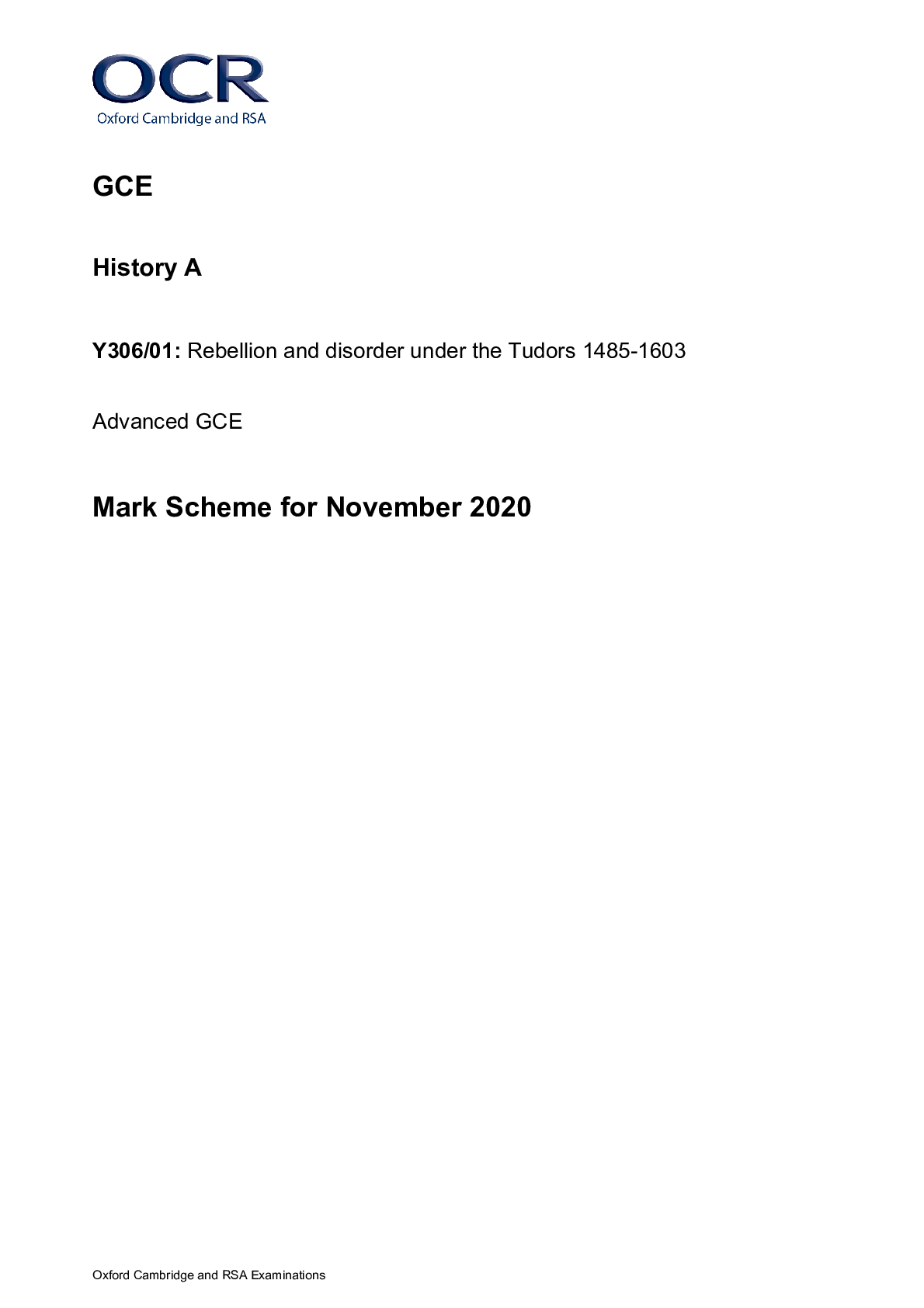 History > AS Mark Scheme > GCE History A Y306/01: Rebellion and disorder under the Tudors 1485-1603 Advanced GCE Mark Scheme for November 2020