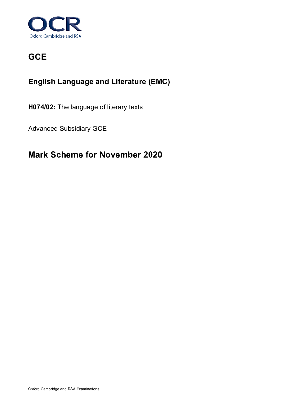 English LiteratureAS Mark Scheme  > GCE English Language and Literature (EMC) H074/02: The language of literary texts Advanced Subsidiary GCE Mark Scheme for November 2020