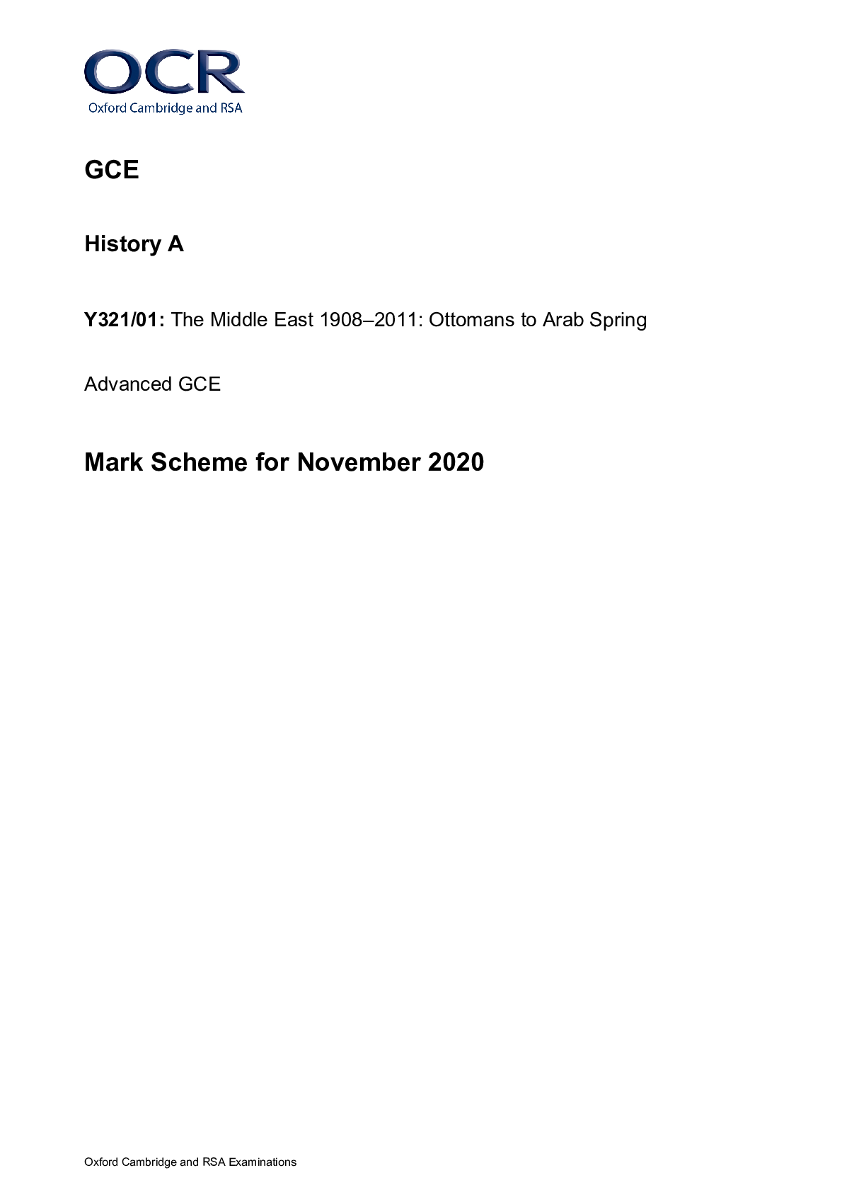 History > AS Mark Scheme > GCE History A Y321/01: The Middle East 1908–2011: Ottomans to Arab Spring Advanced GCE Mark Scheme for November 2020