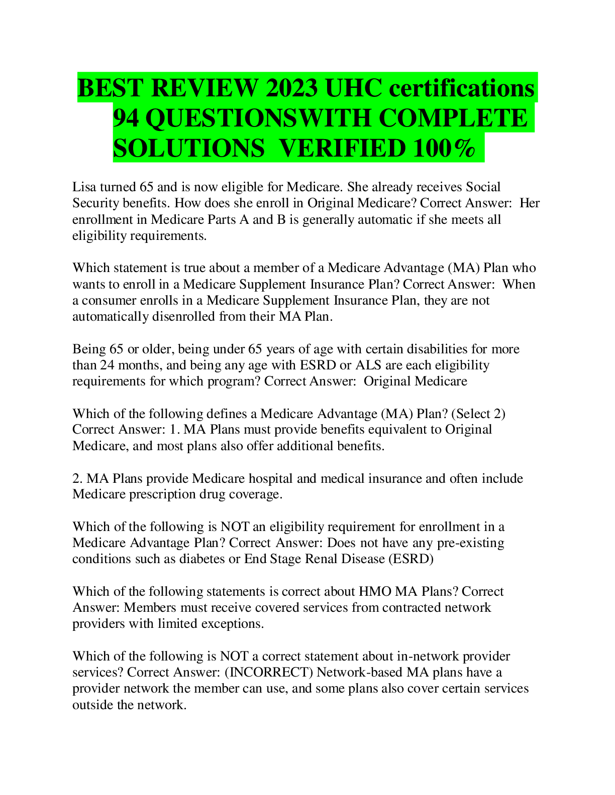 Health Care > ANSWERS AND COMMENTARIES > BEST REVIEW 2023 UHC certifications 94 QUESTIONS WITH COMPLETE SOLUTIONS VERIFIED 100%