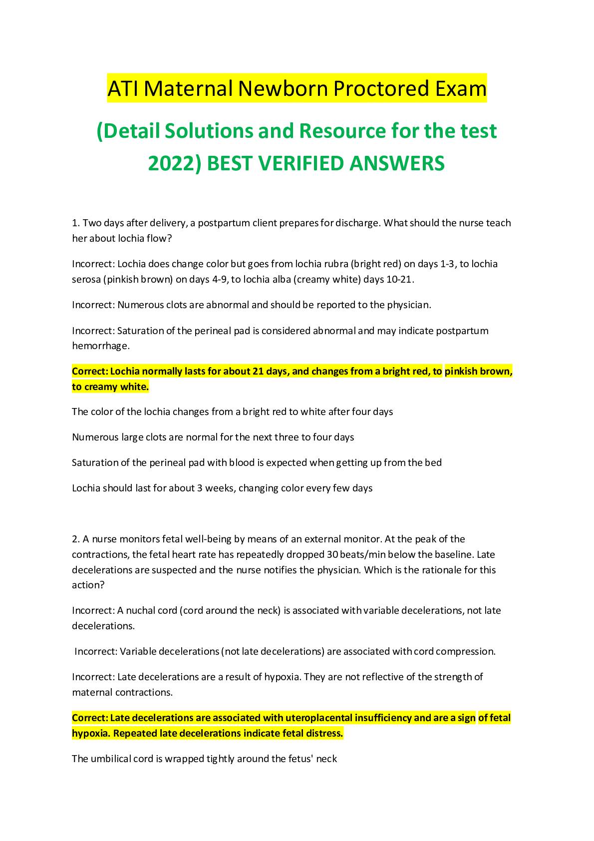 Health Care > ANSWERS AND COMMENTARIES > ATI Maternal Newborn Proctored Exam (Detail Solutions and Resource for the test 2022) BEST VERIFIED ANSWERS