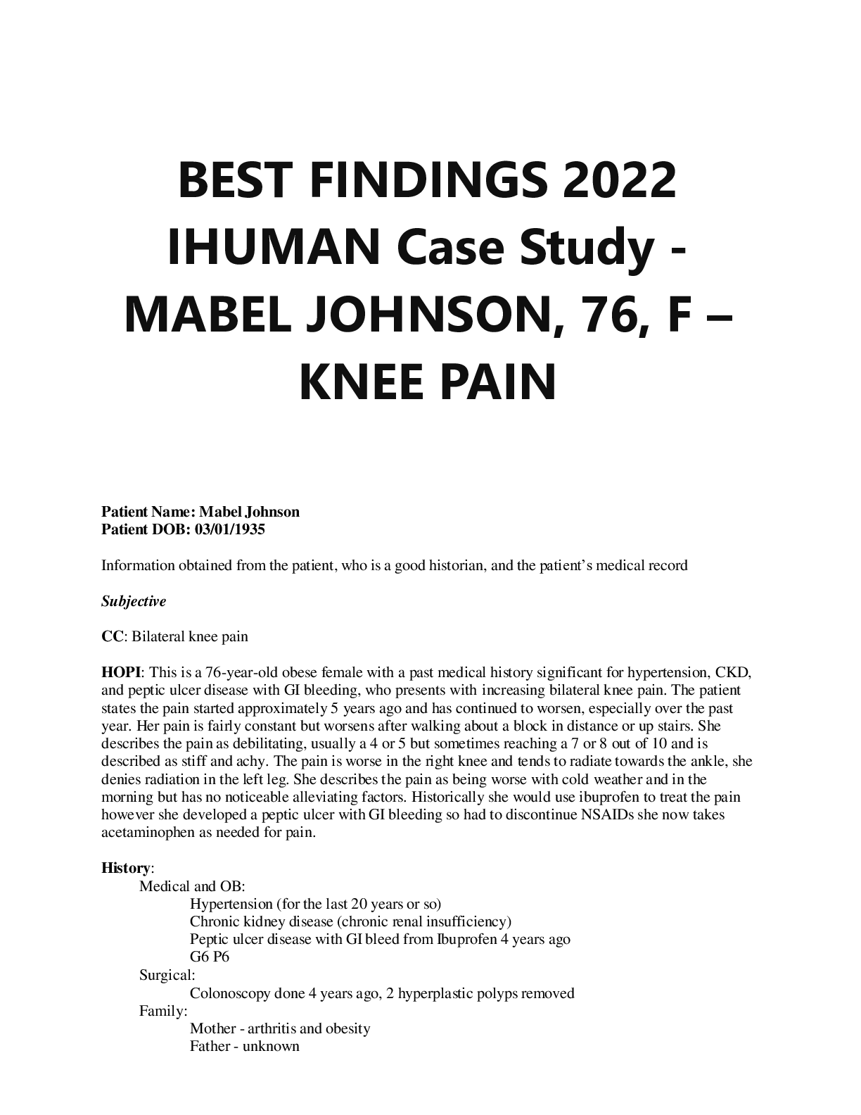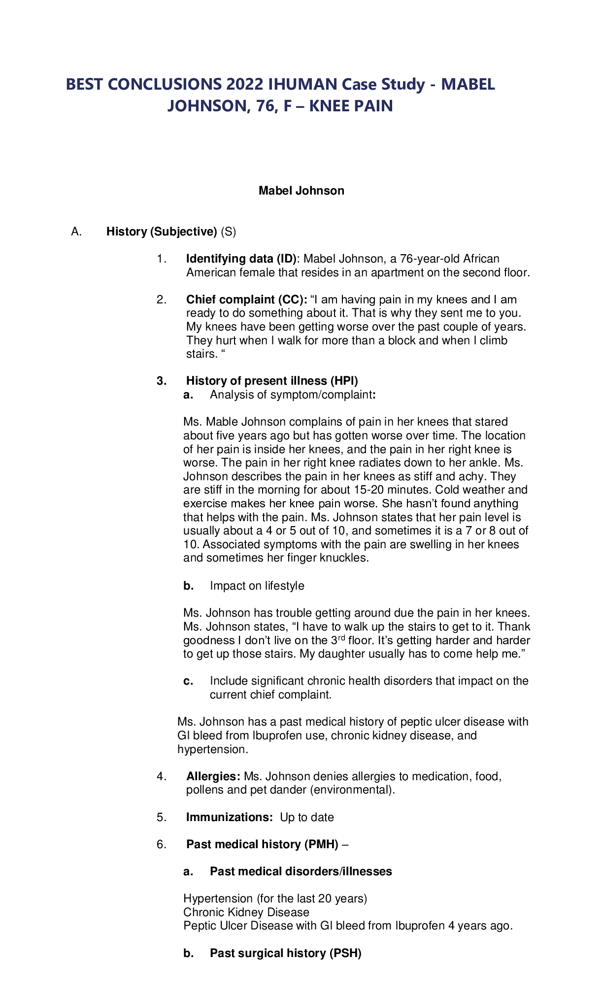 Health Care > ANSWERS AND COMMENTARIES > BEST CONCLUSIONS 2022 IHUMAN Case Study - MABEL JOHNSON, 76, F – KNEE PAIN