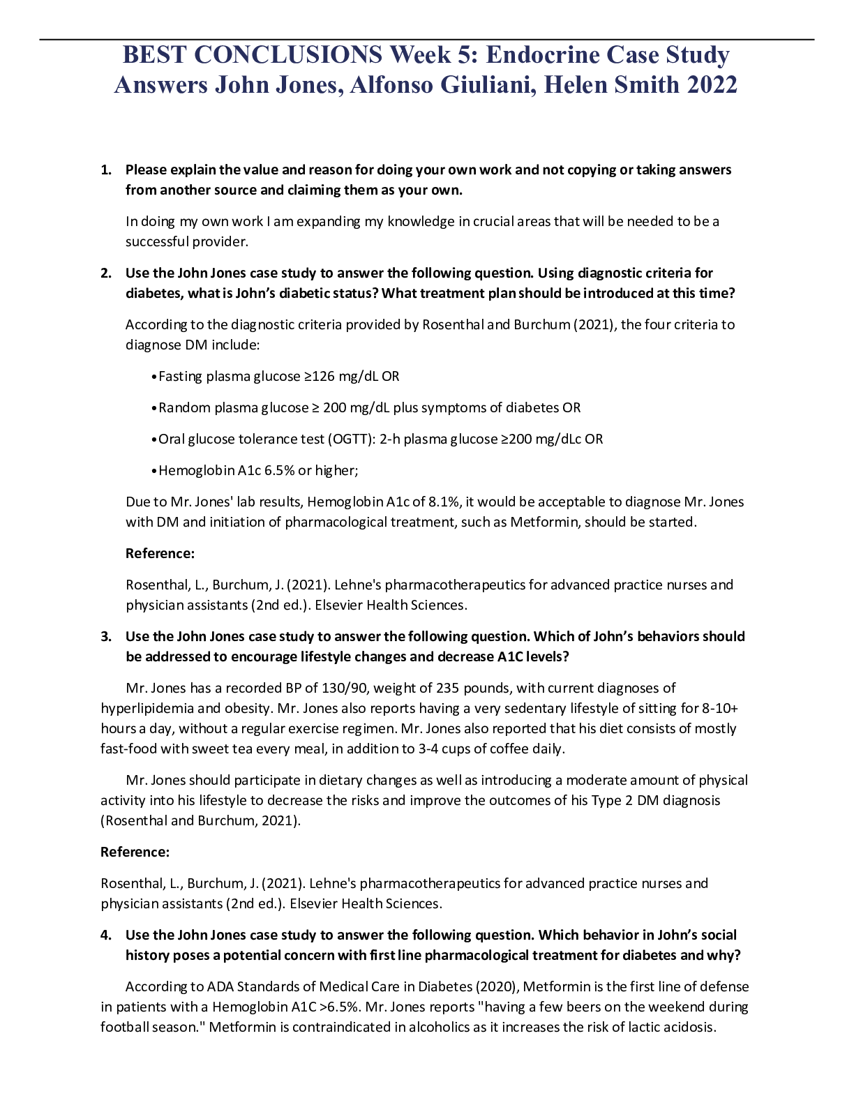 Health Care > ANSWERS AND COMMENTARIES > BEST CONCLUSIONS Week 5: Endocrine Case Study Answers John Jones, Alfonso Giuliani, Helen Smith 2022